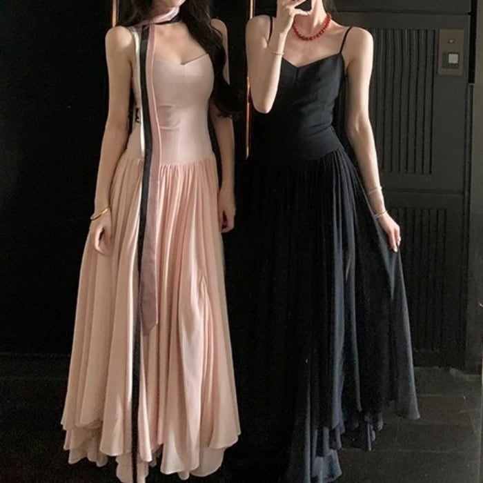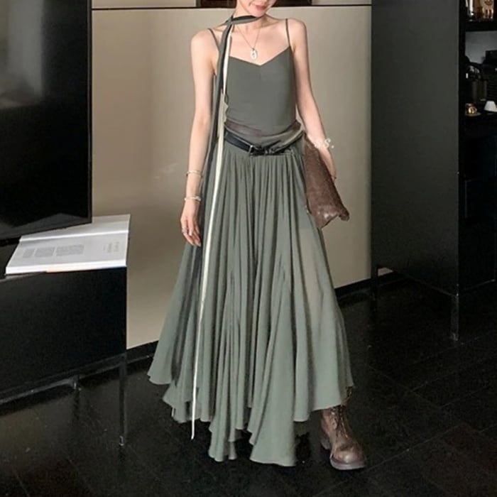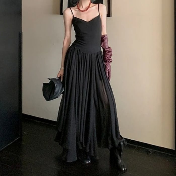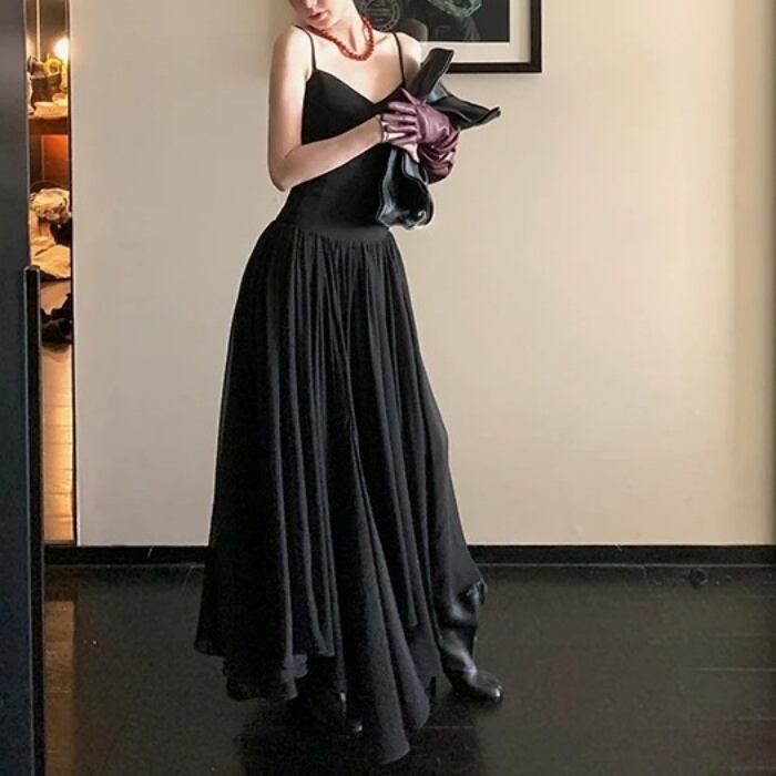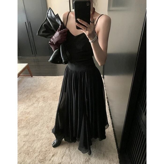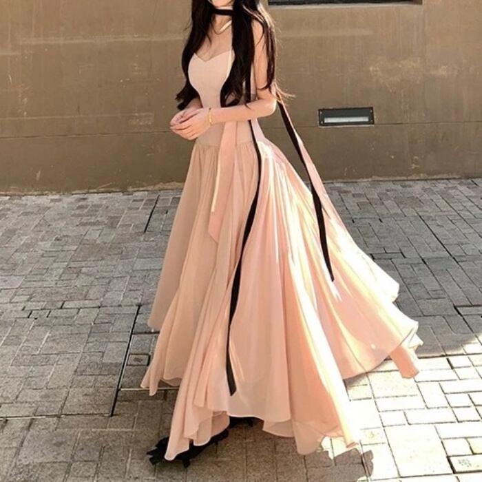 ウエストプリーツAラインワンピースドレス[XS-L]