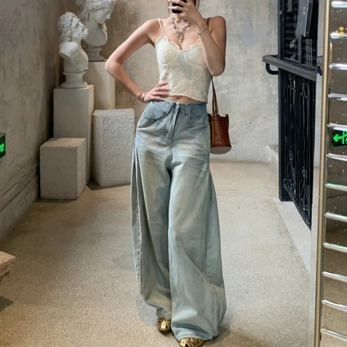 サイドプリーツワイドレッグデニムパンツ[S-L]