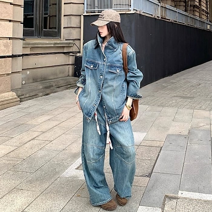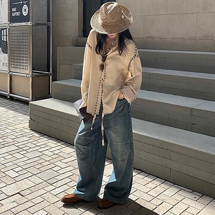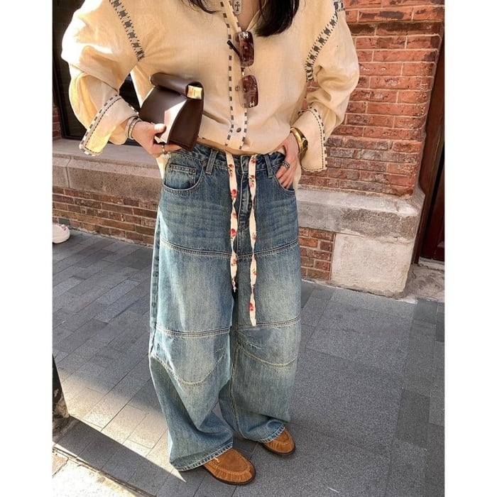 3Dステッチワイドカーブデニムパンツ[XS-XL]