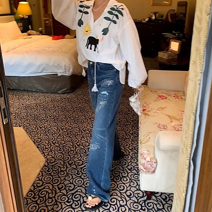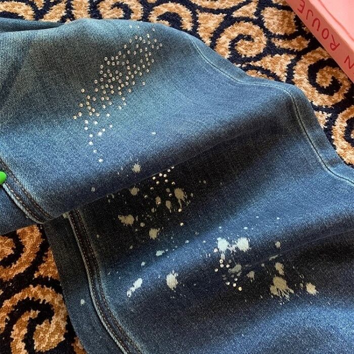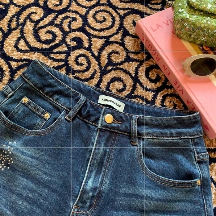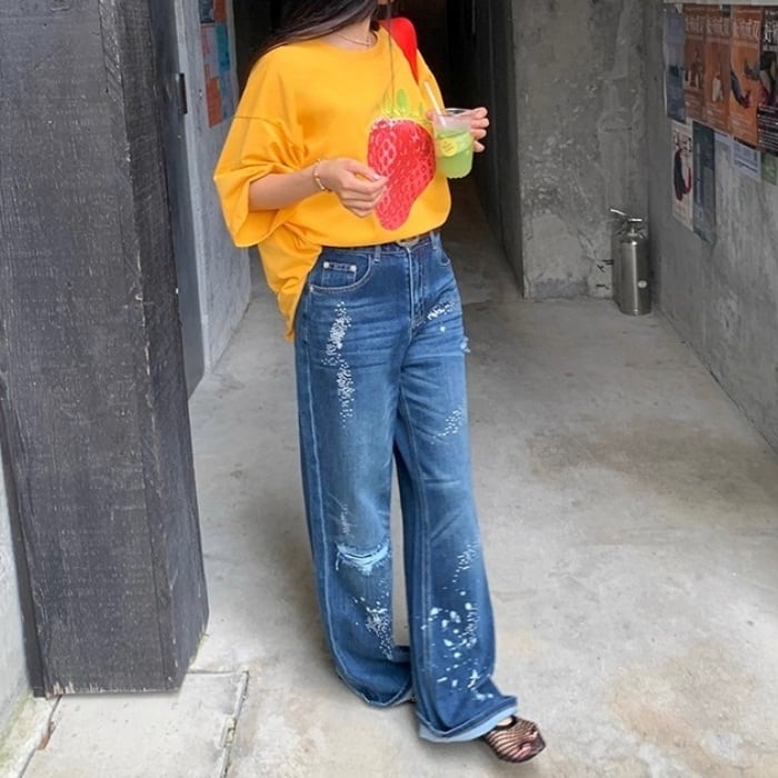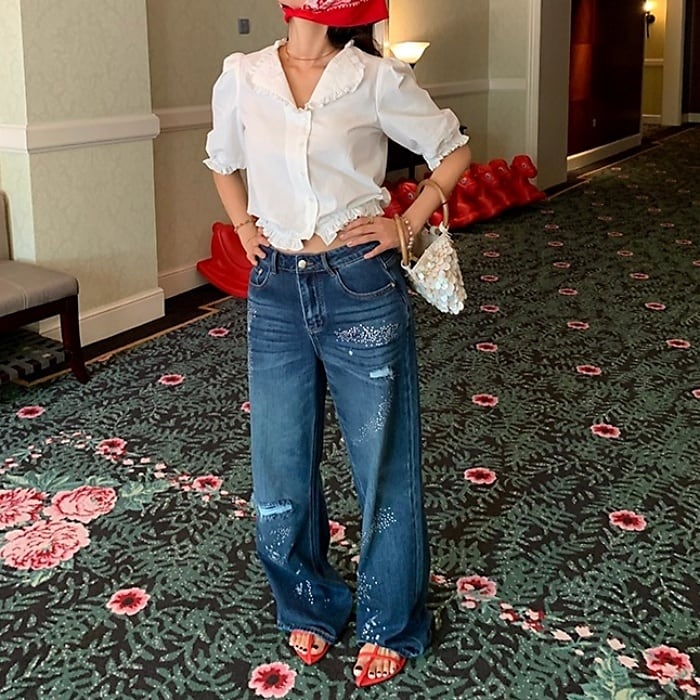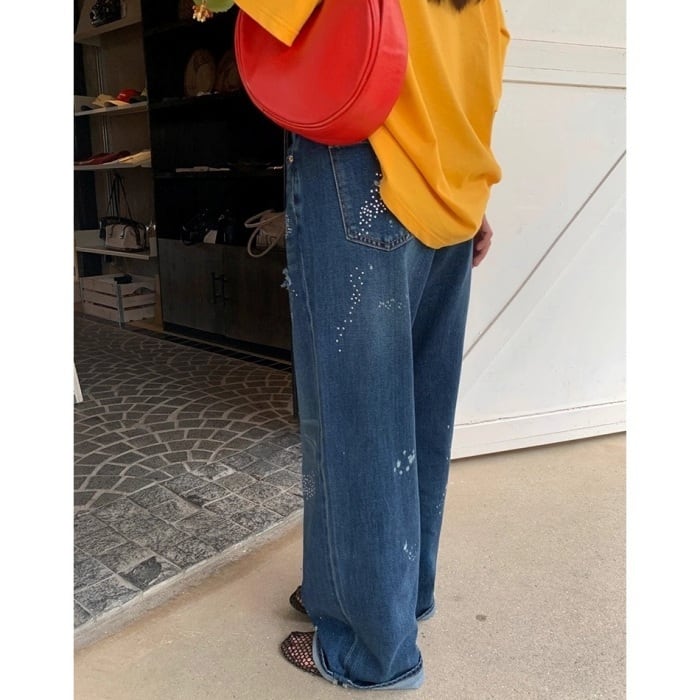 ラインストーンダメージストレートデニムパンツ[S-L]