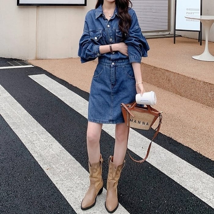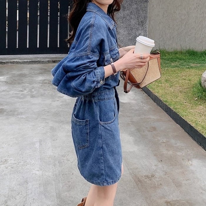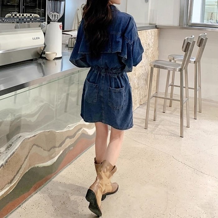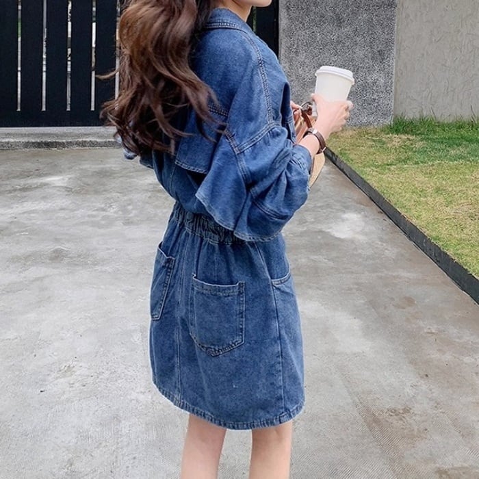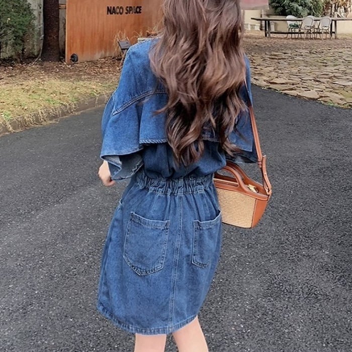 バックフリルデザインデニムワンピース[XS-XXL]