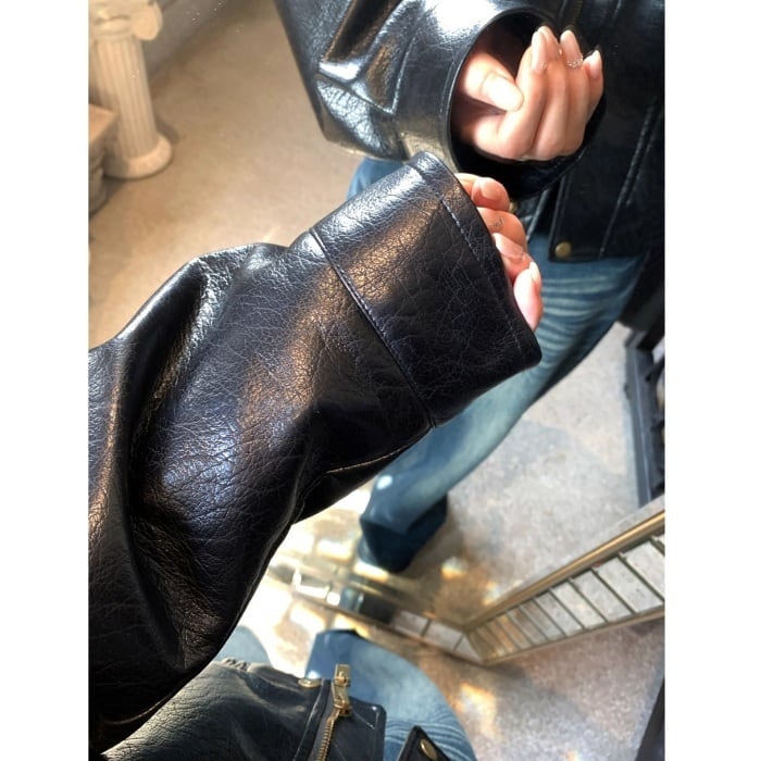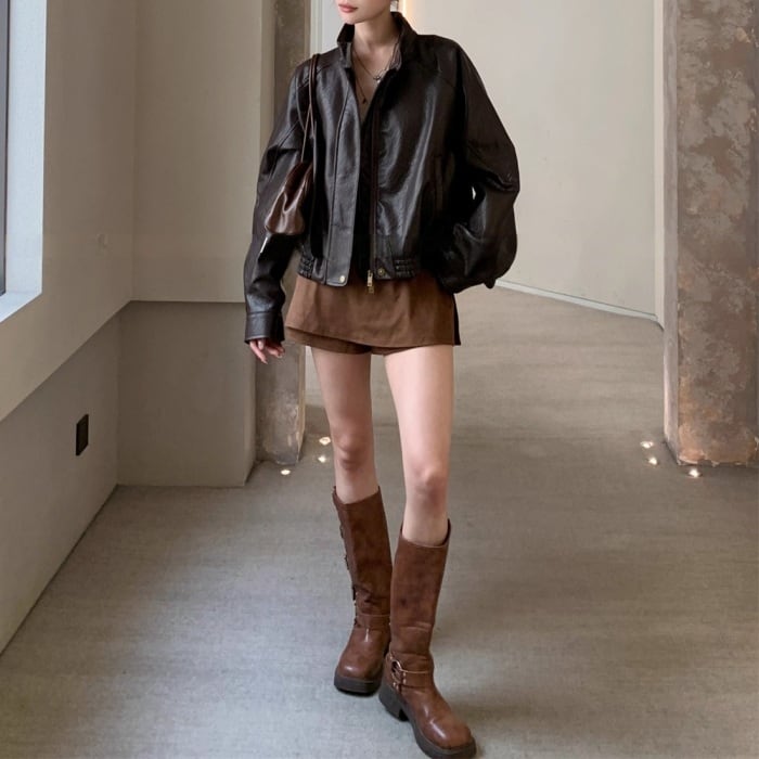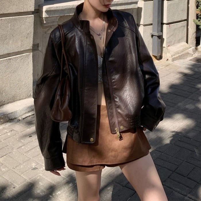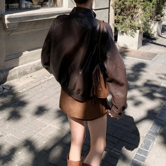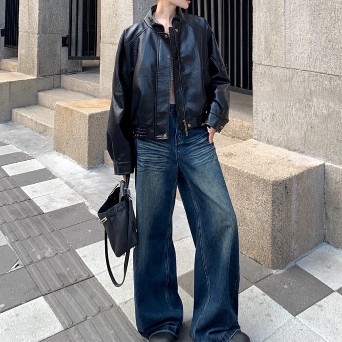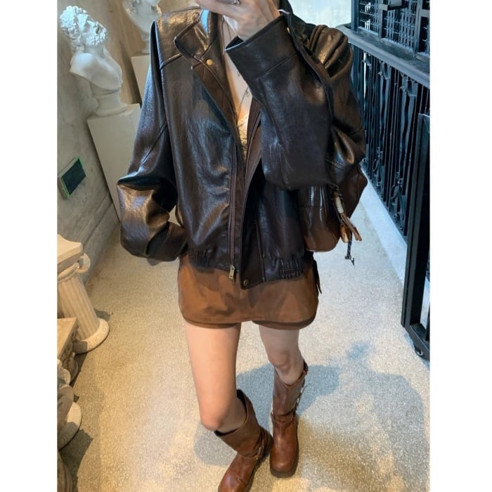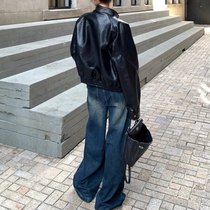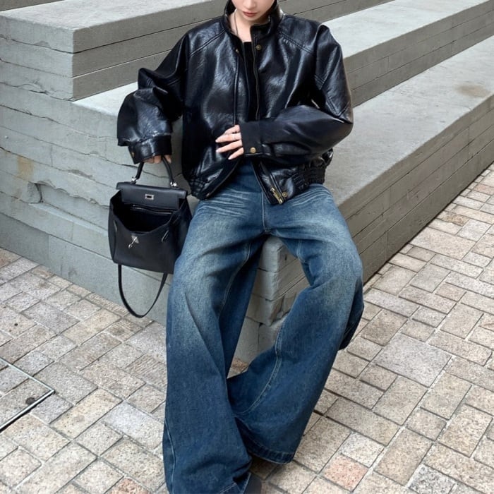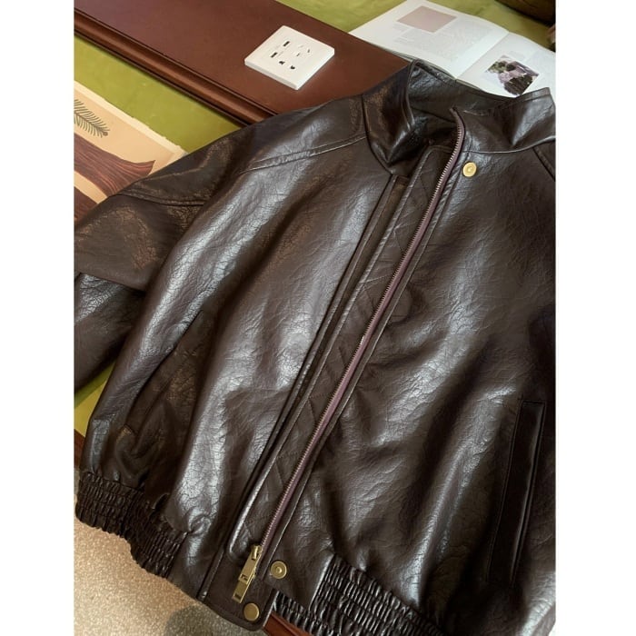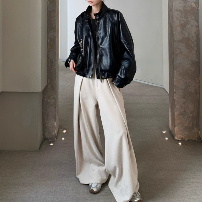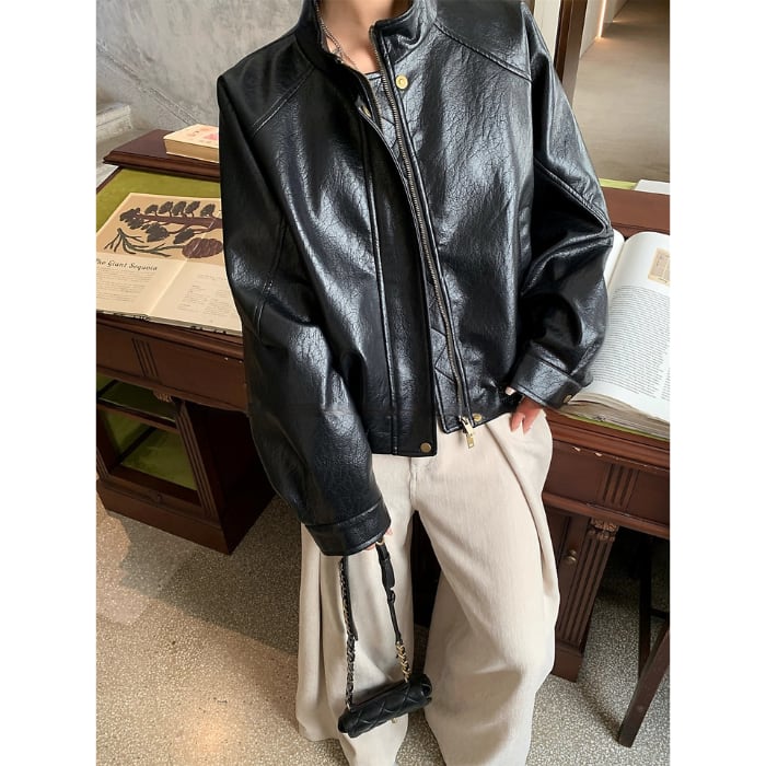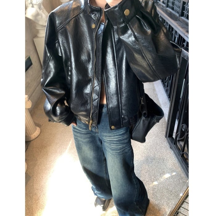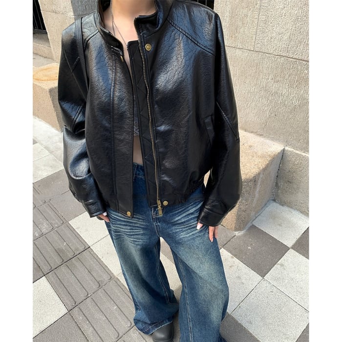 スタンドカラーグロッシーエコレザージャケット[S-L]