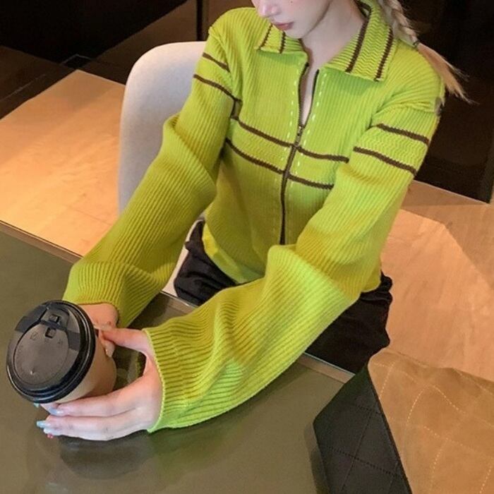 コントラストラインジッパーポロカラーニット[XS-L]