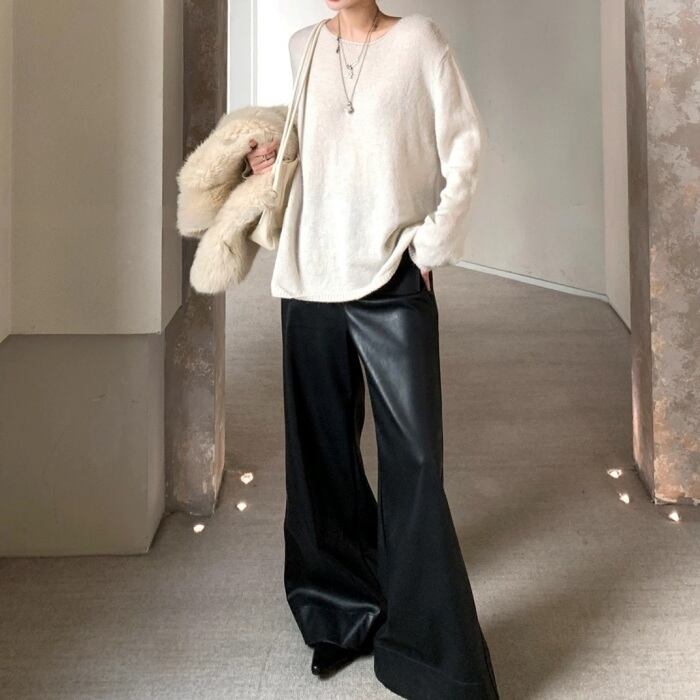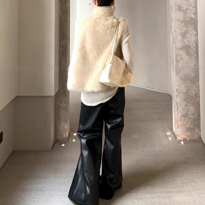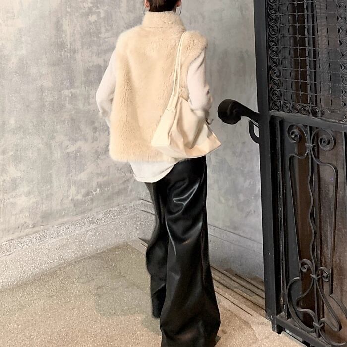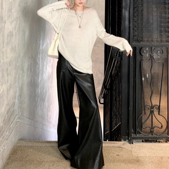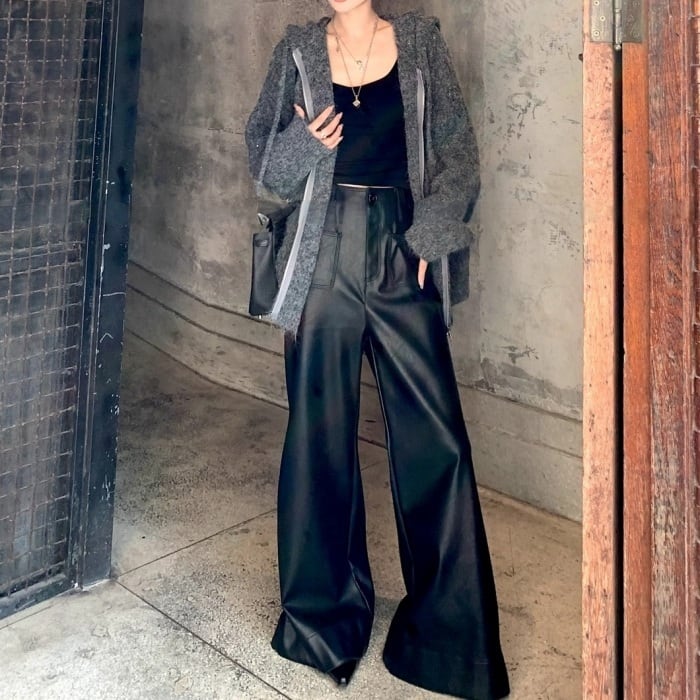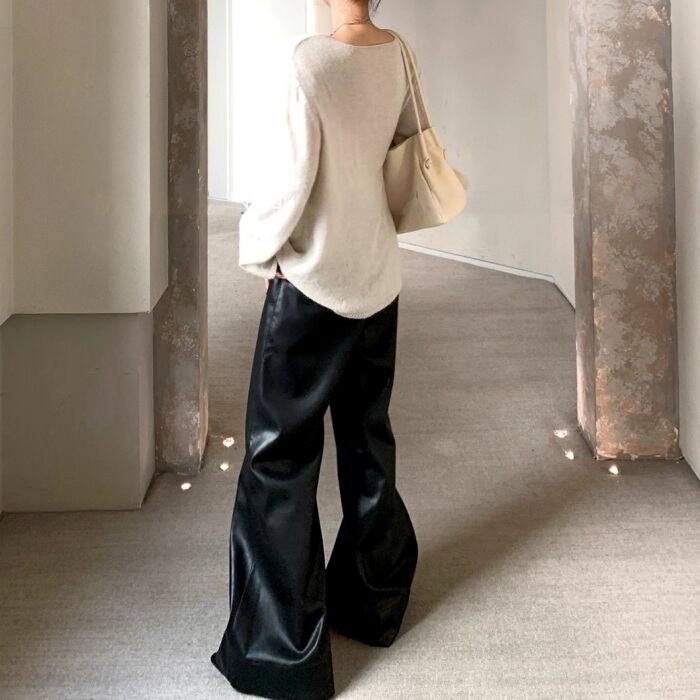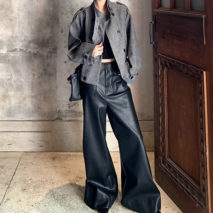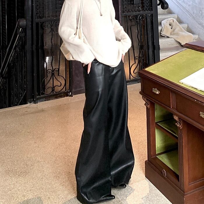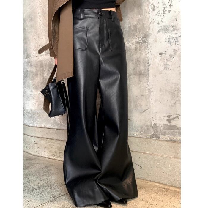3DポケットワイドフレアPUレザーパンツ[S-L]