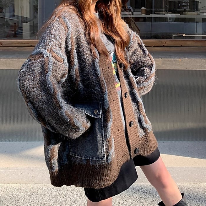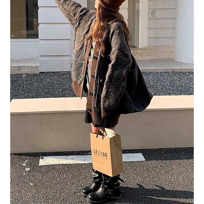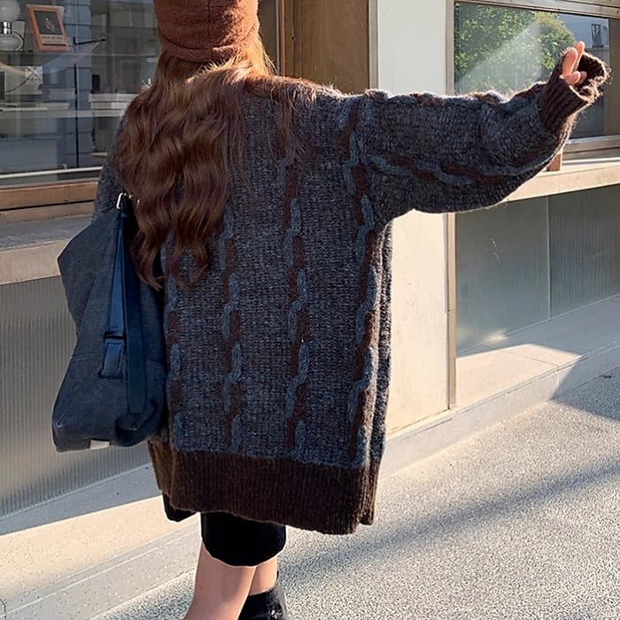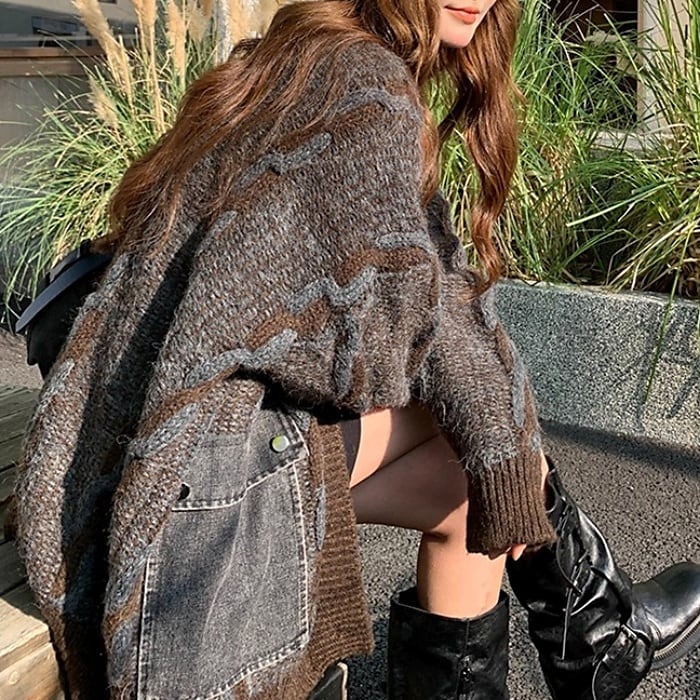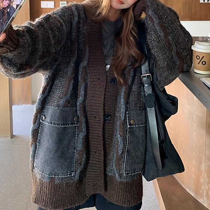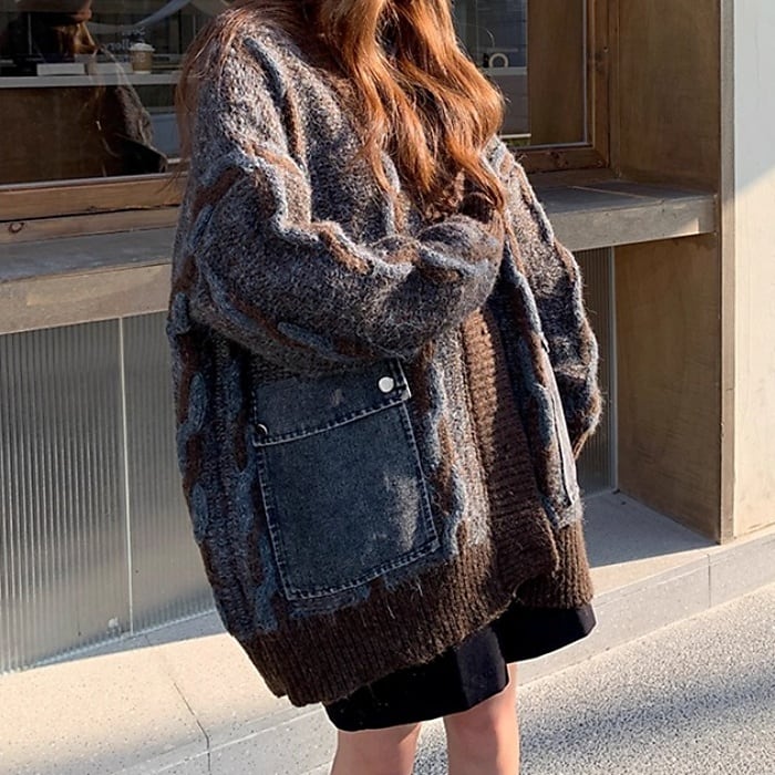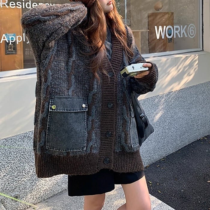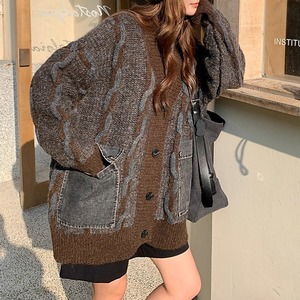 デニムポケットルーズケーブルニットカーディガン[XS-XL]