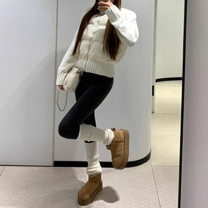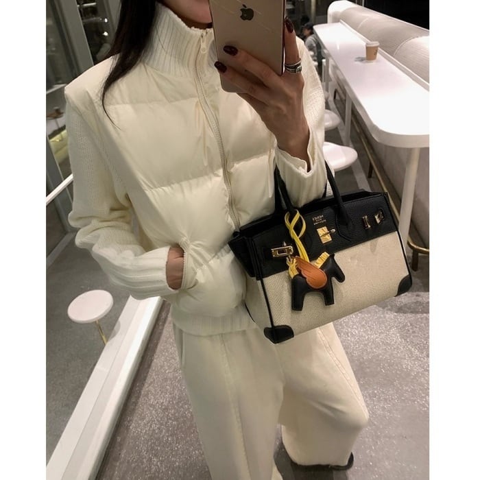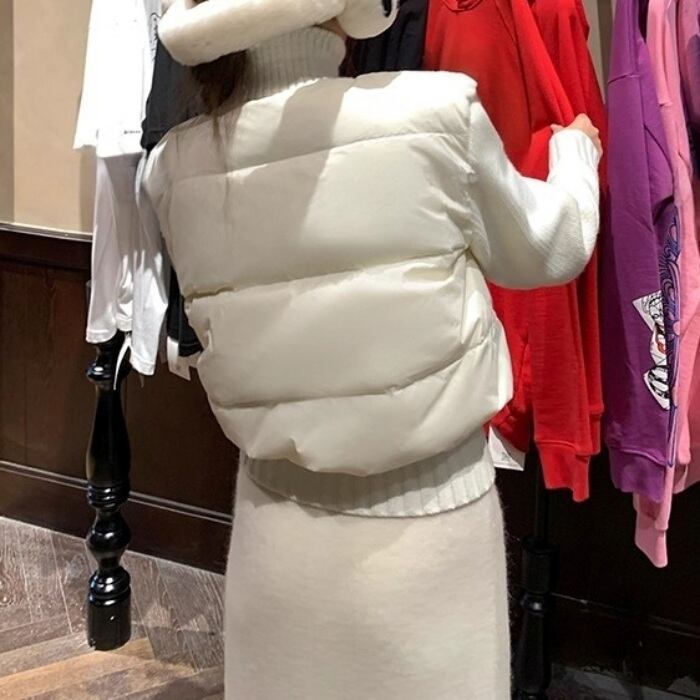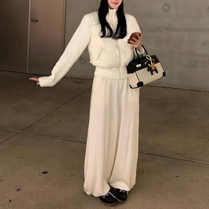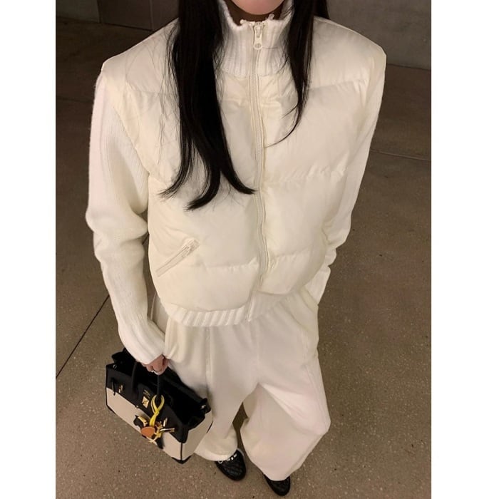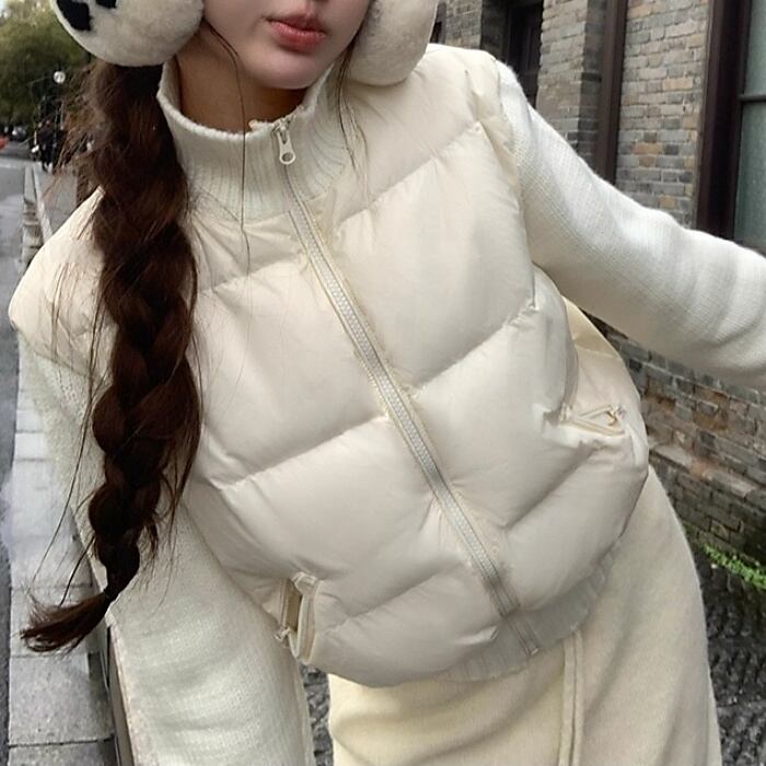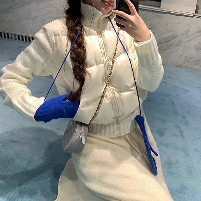 ●素材 ダウン生地:ナイロン100%/ニット生地:アクリル82.3%、ビスコース9.3%、ポリエステル5.1%、ナイロン3.3%(裏地:ポリエステル100%)(詰め物:ホワイトダックダウン90%)