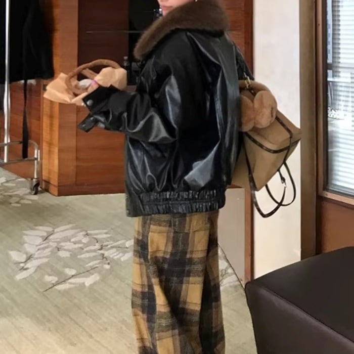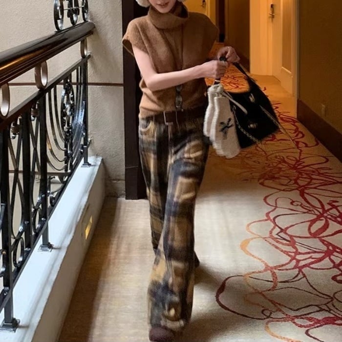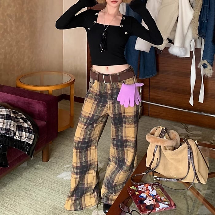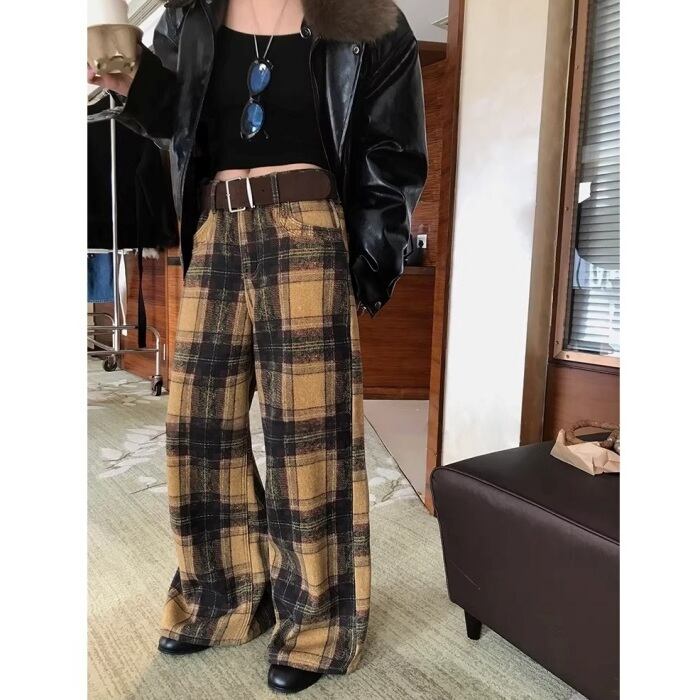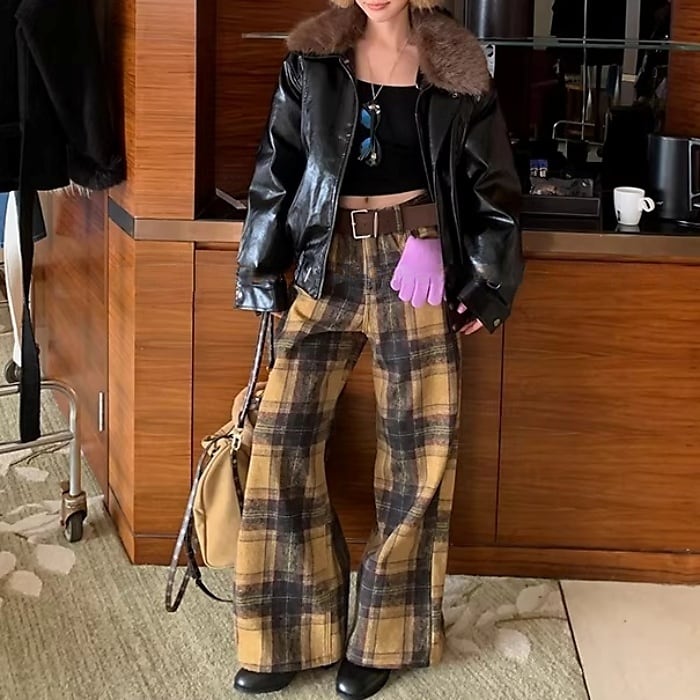インナーフリースチェックワイドレッグパンツ[S-L]