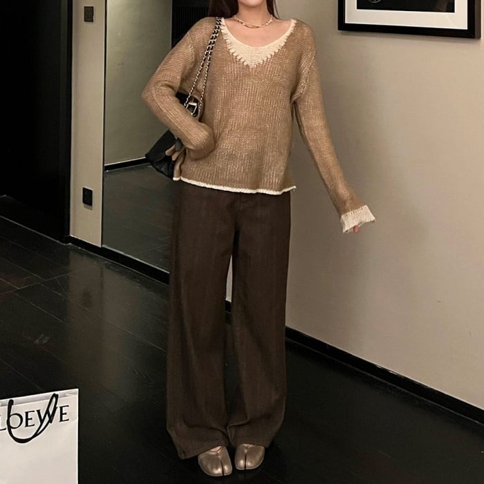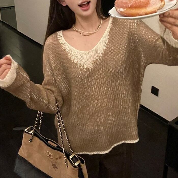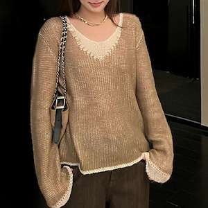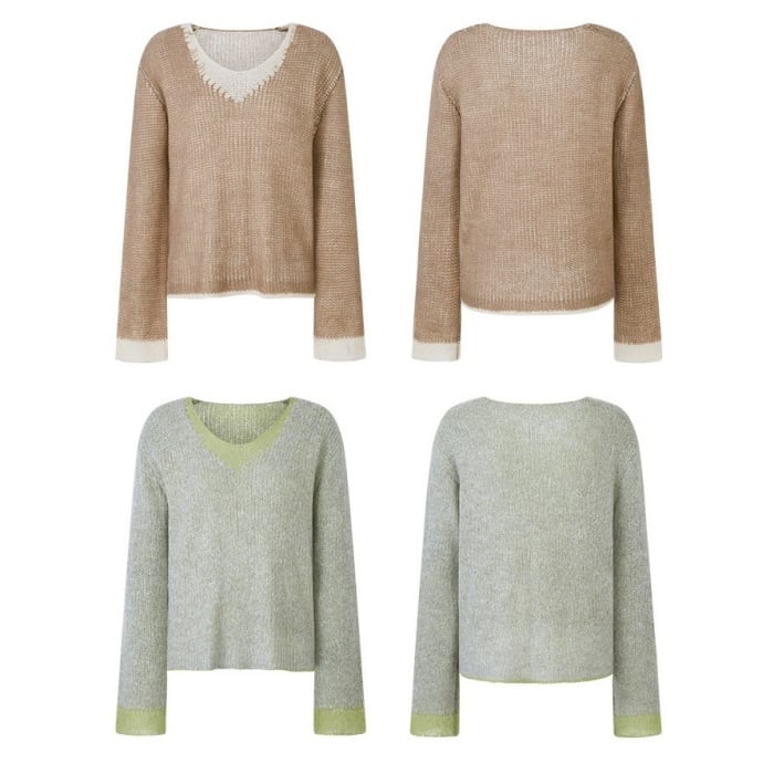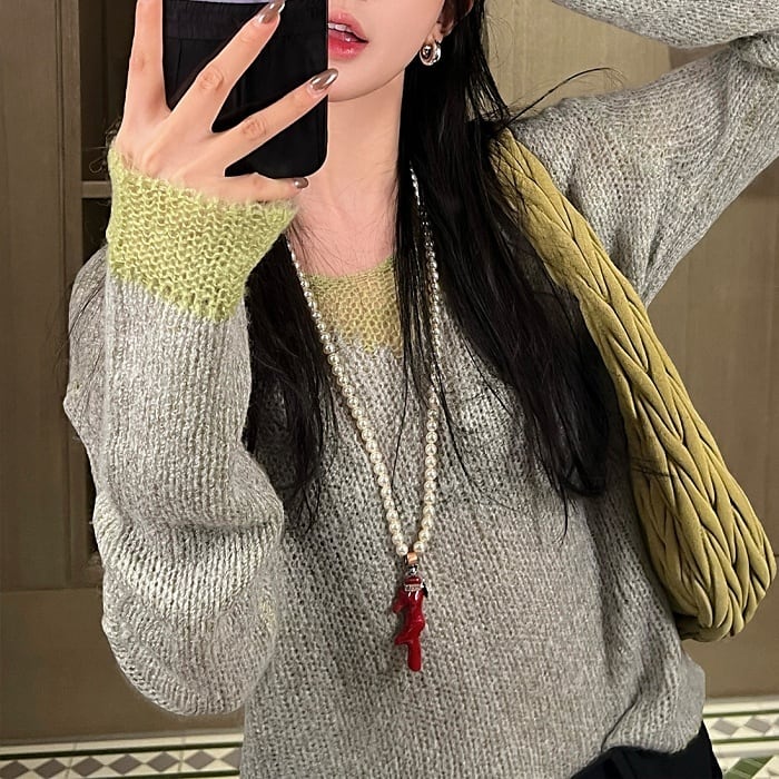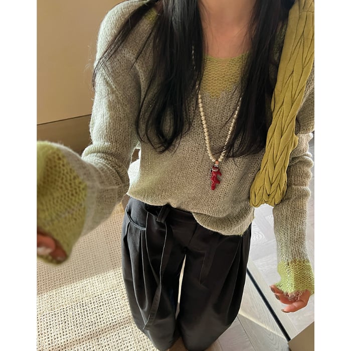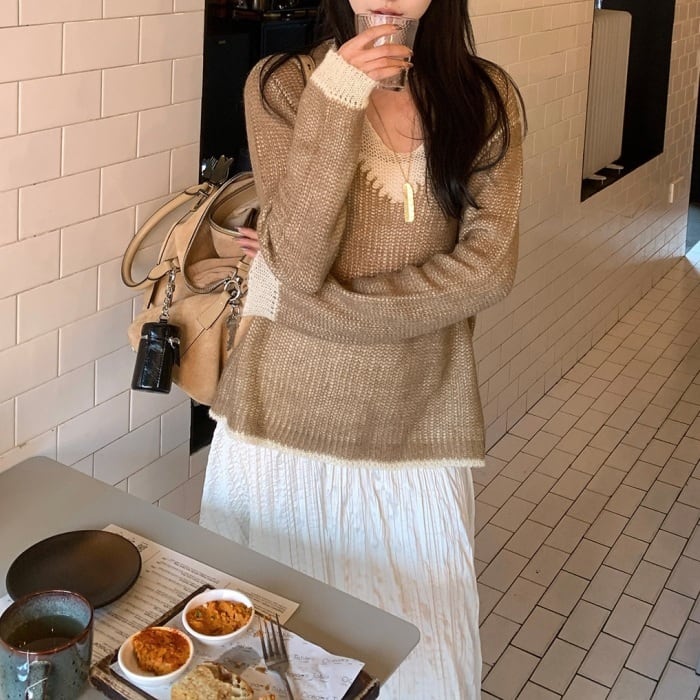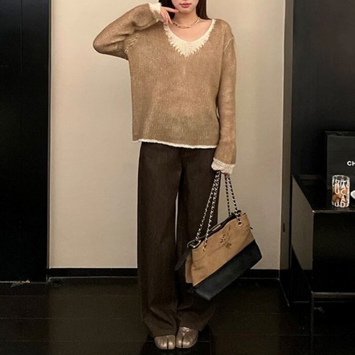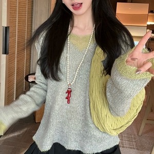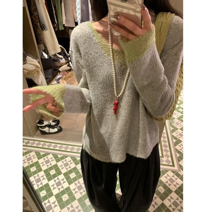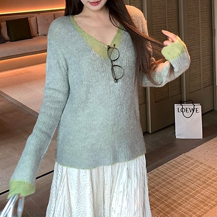 カラーブロックVネックスカシモヘアニット[XS-L]
