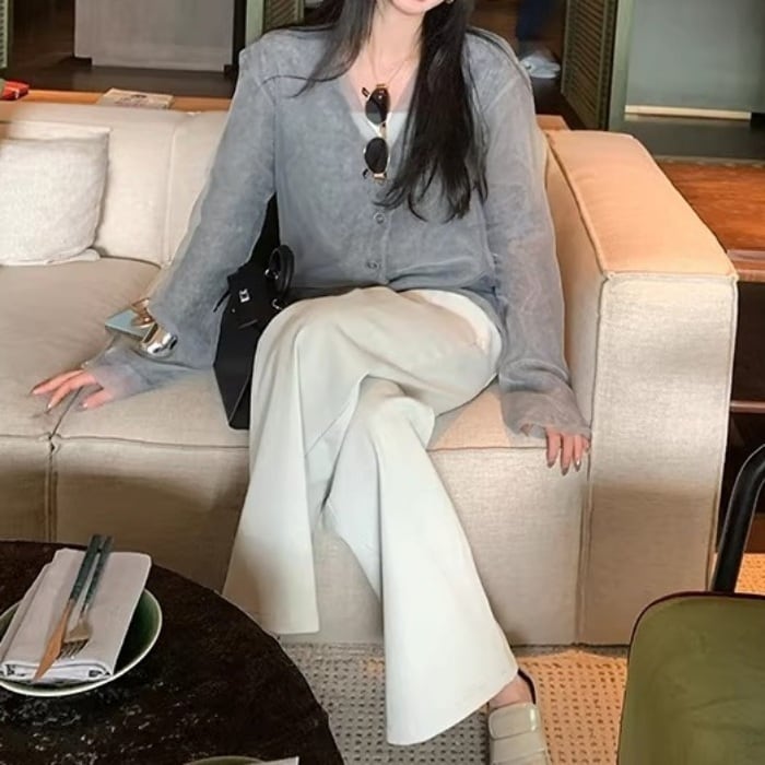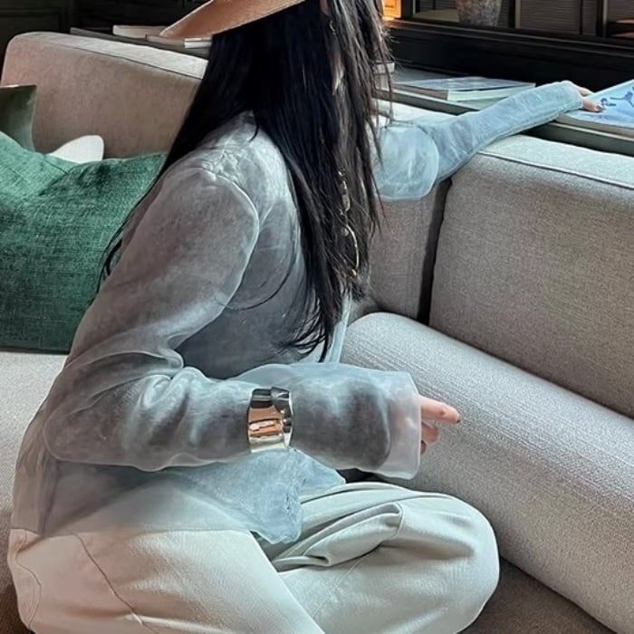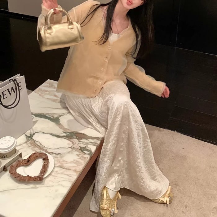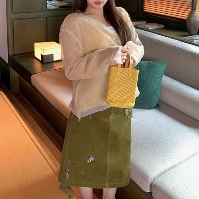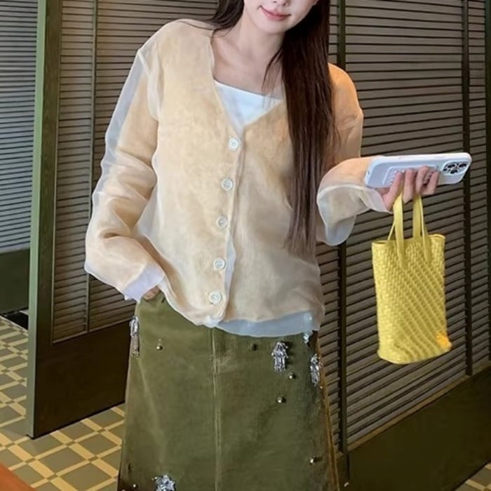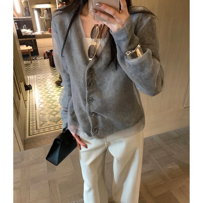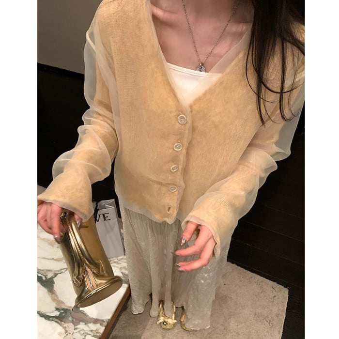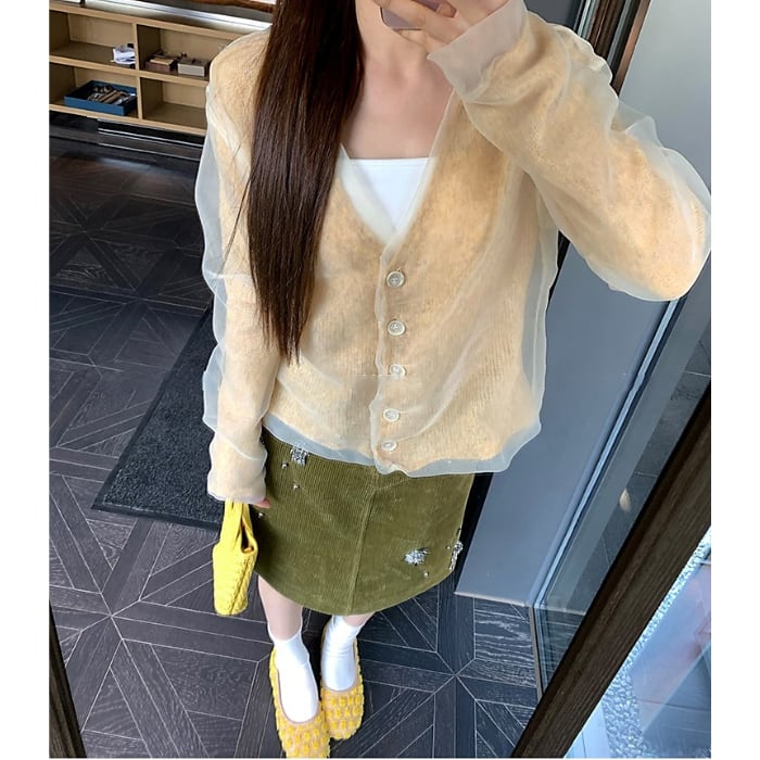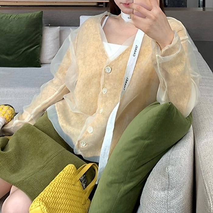●素材 シアー素材:ポリエステル100%/ニット素材:アクリル28.4%、羊毛25.8%、ナイロン24.0%、アルパカウール17.9%、スパンデックス3.9%。