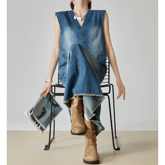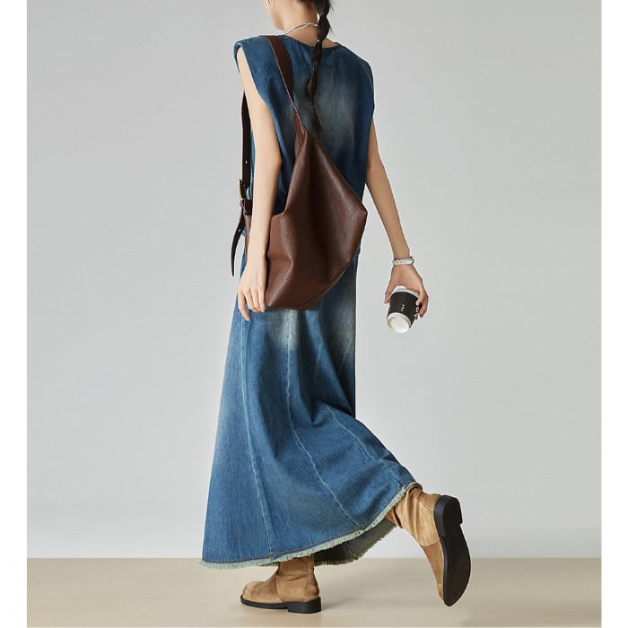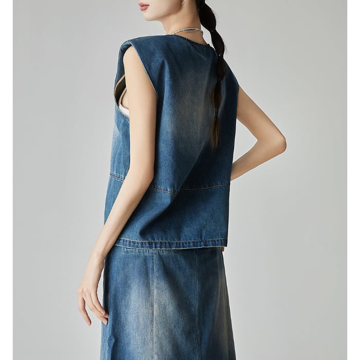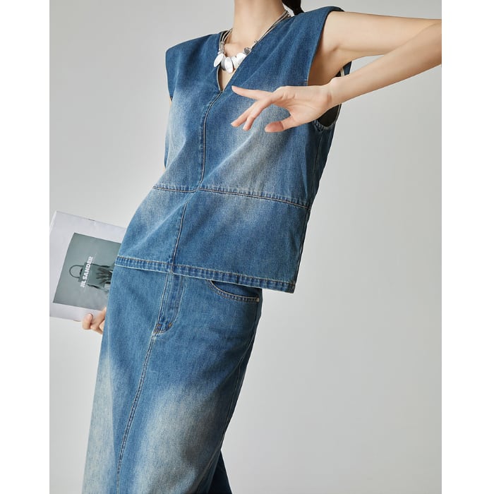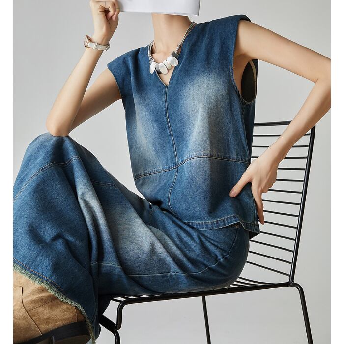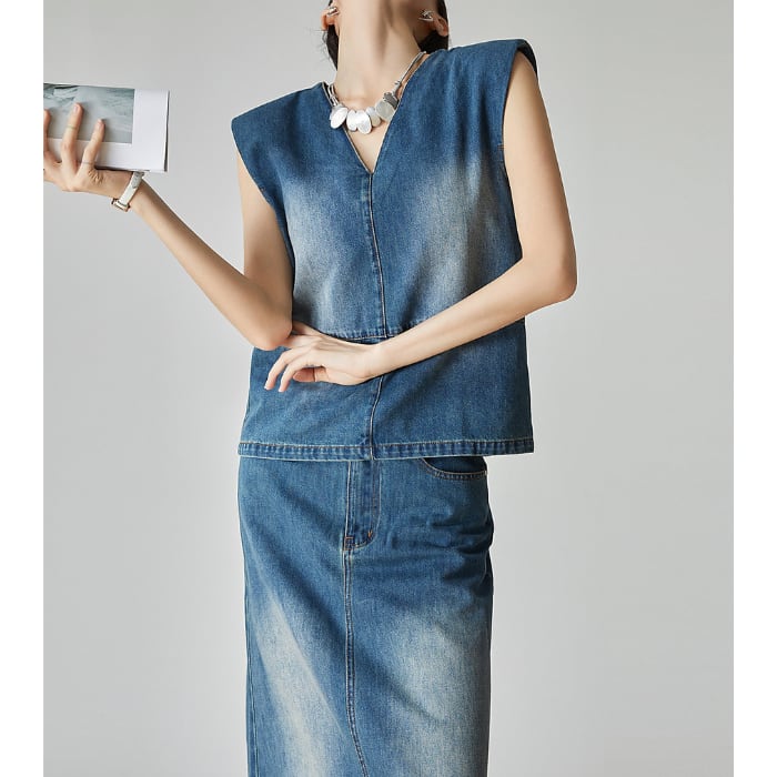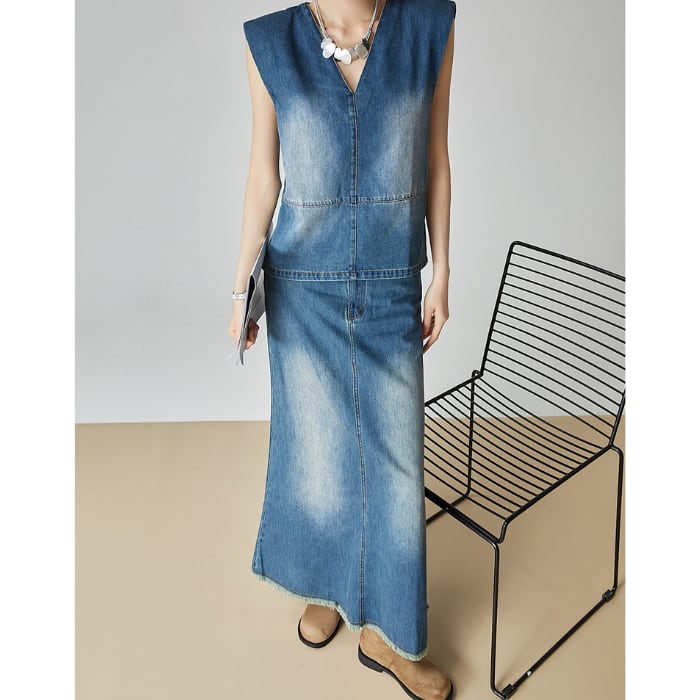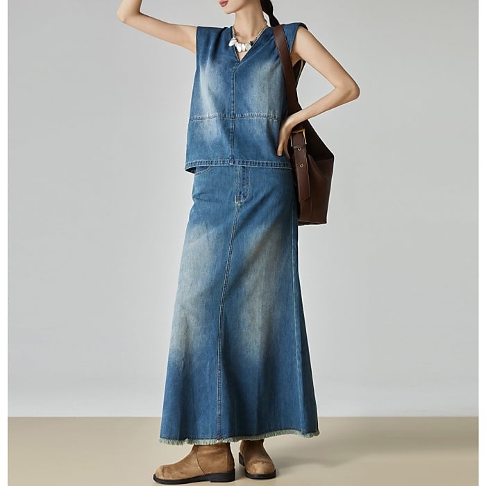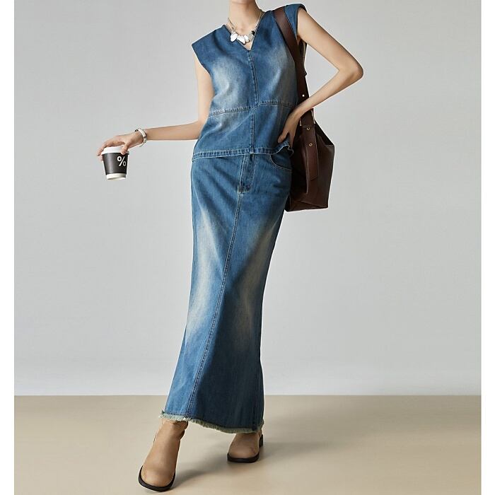ノースリーブトップスロングスカート デニムセットアップ[S-XL]