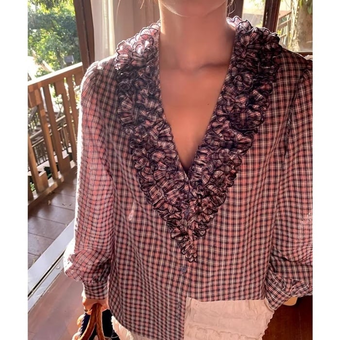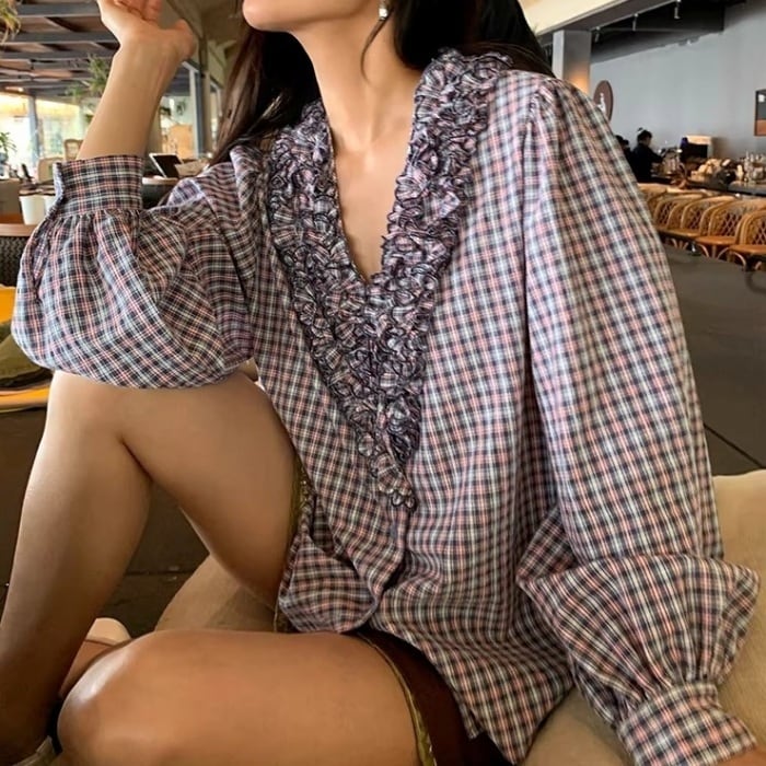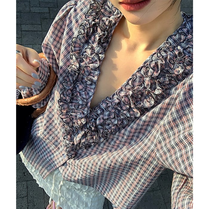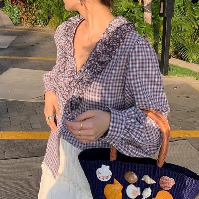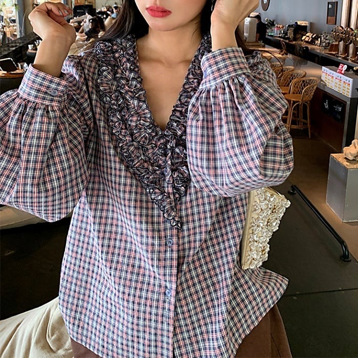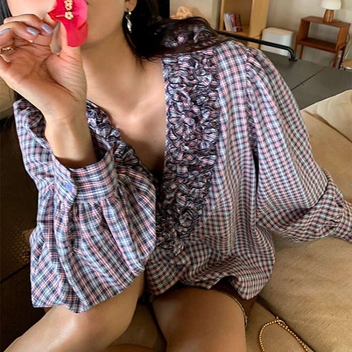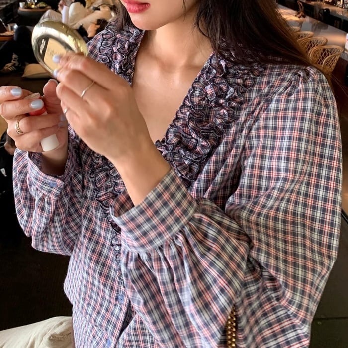 フリルトリムVネックチェックシャツ[S-L]