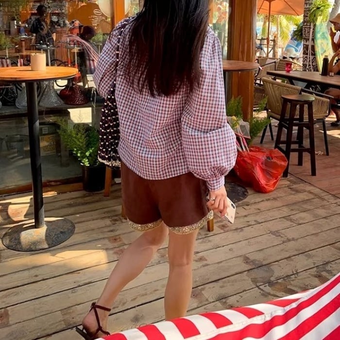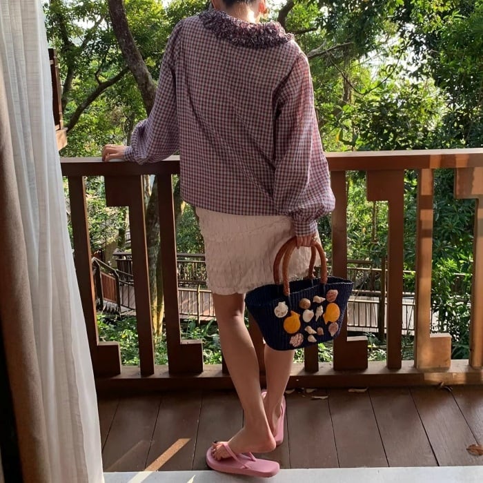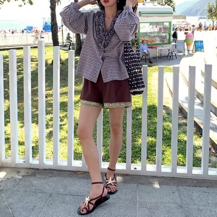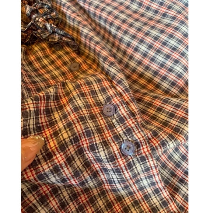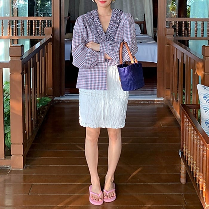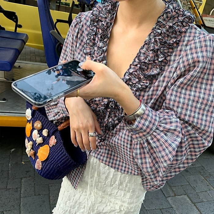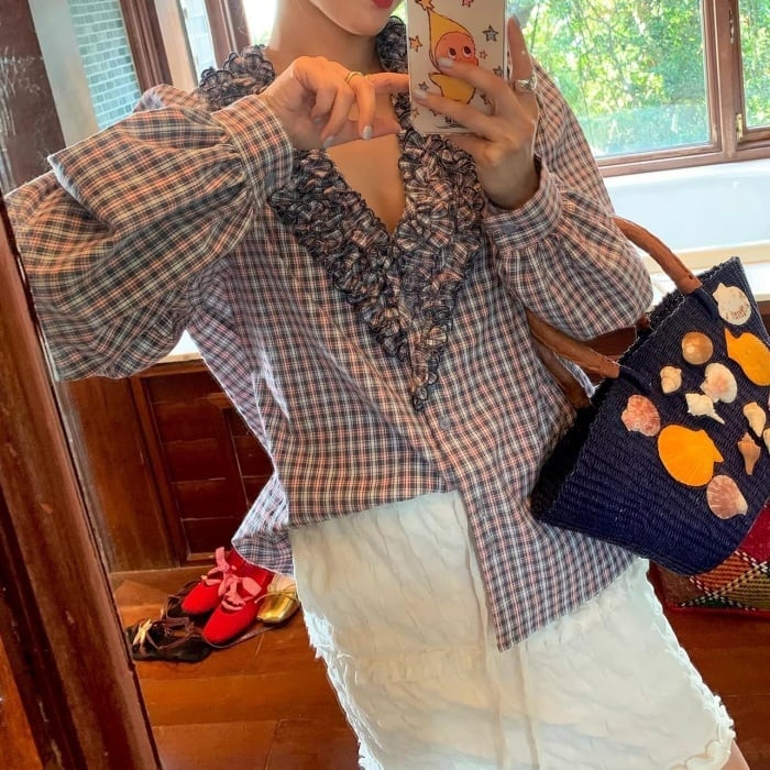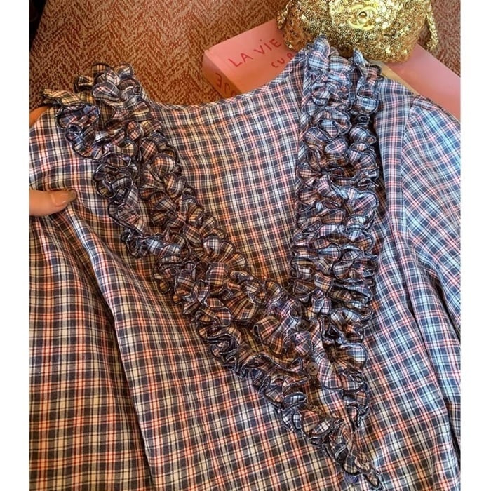 フリルトリムVネックチェックシャツ[S-L]