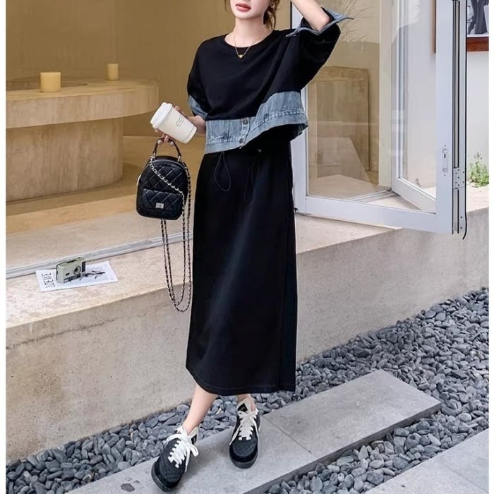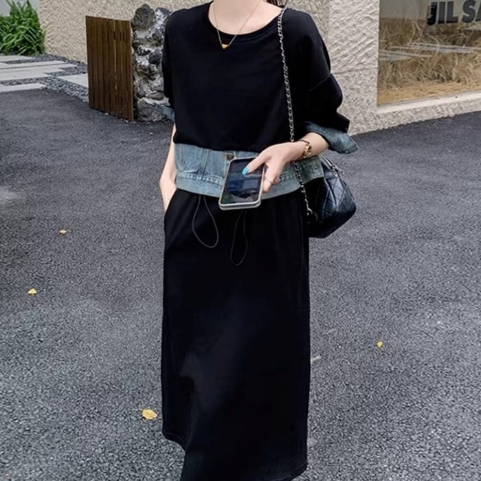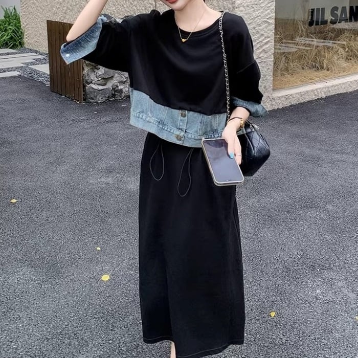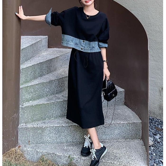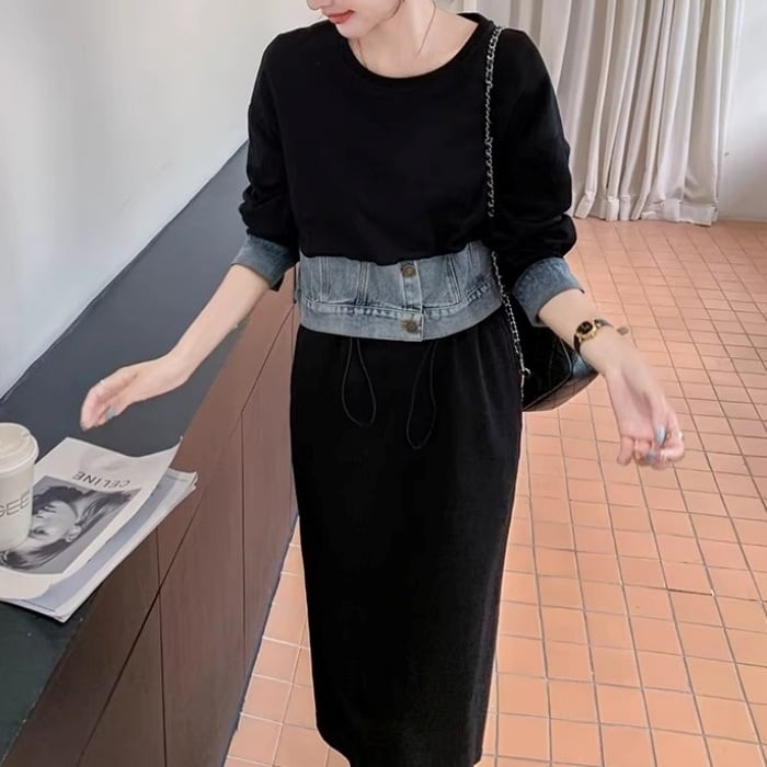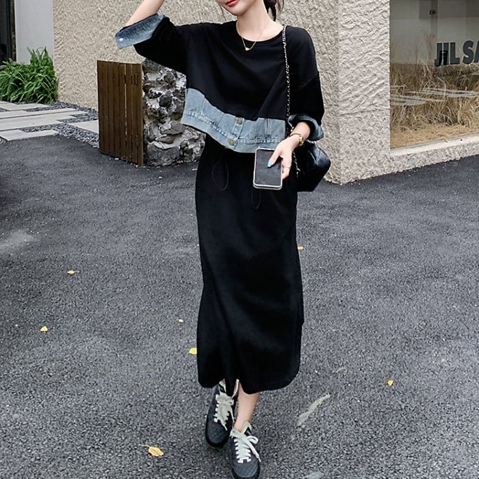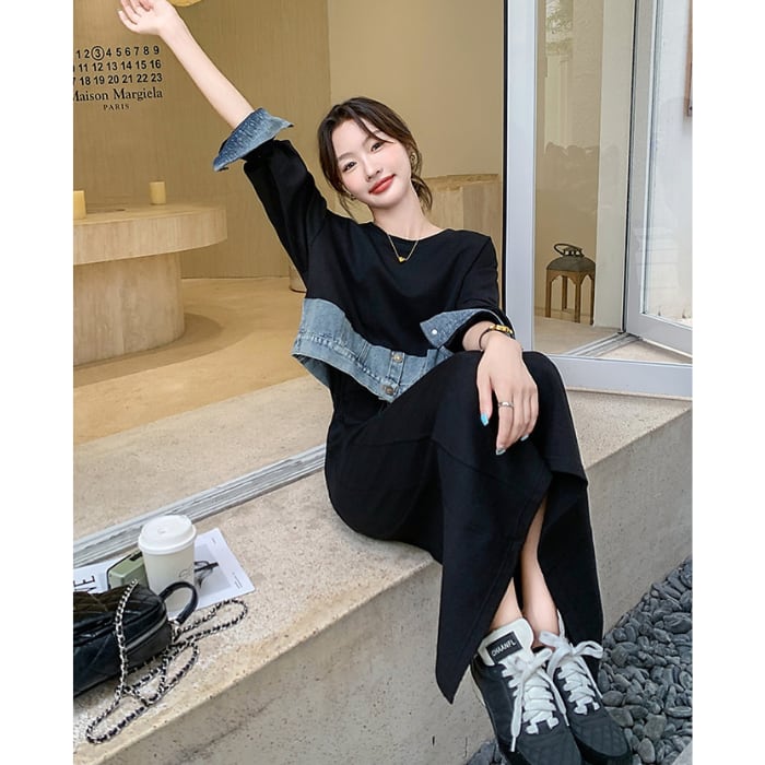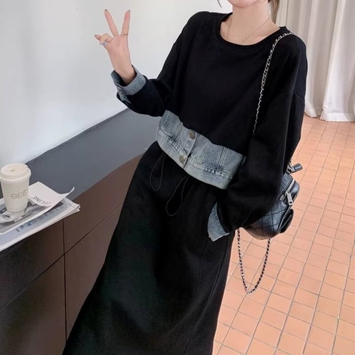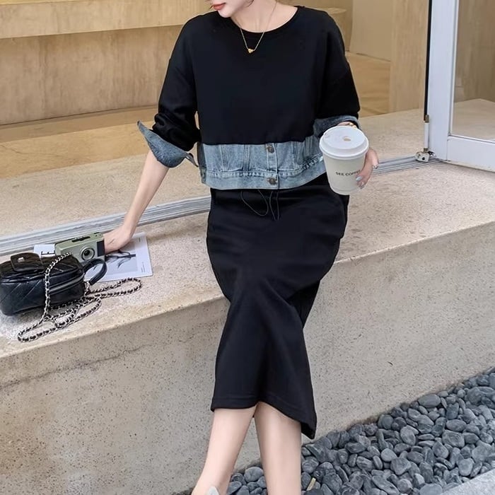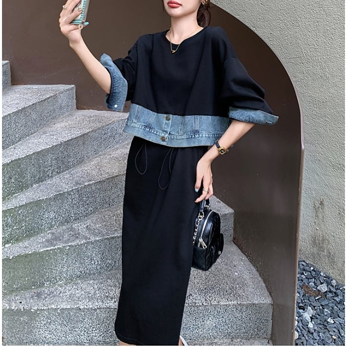 ドッキングデニムスウェットワンピース[XS-XL]