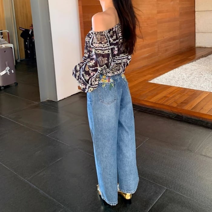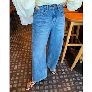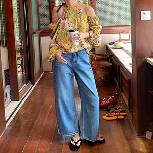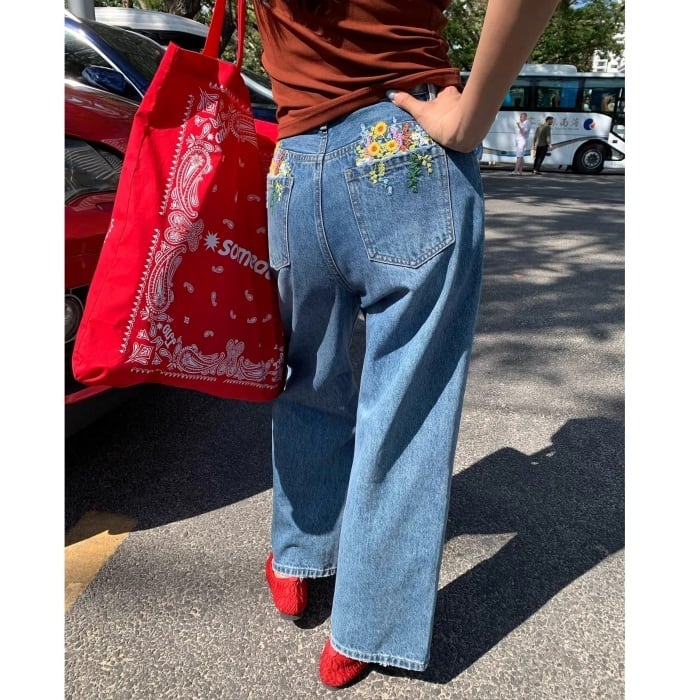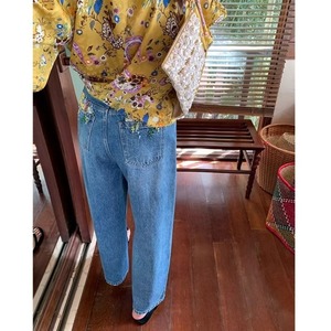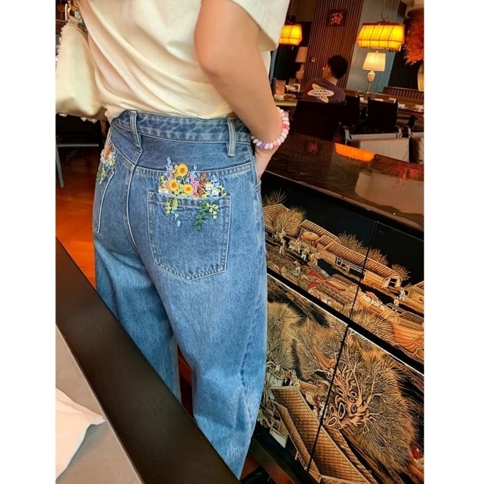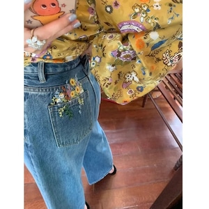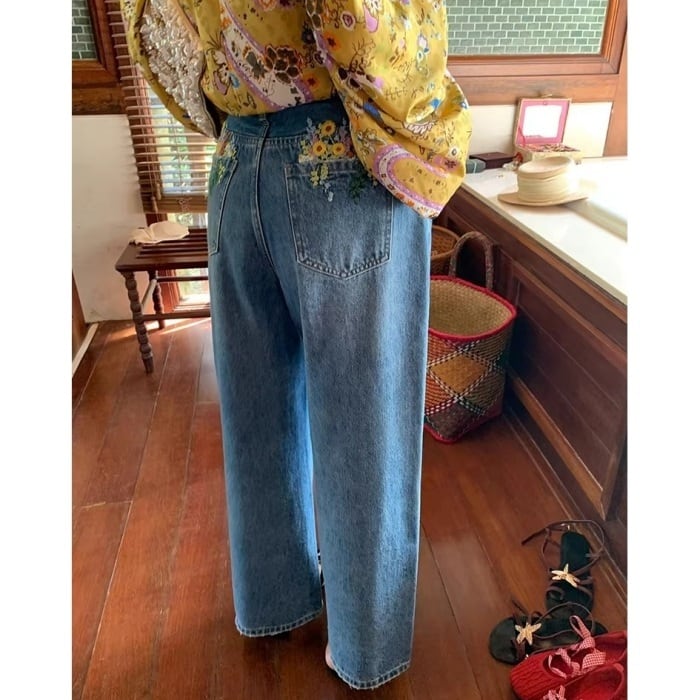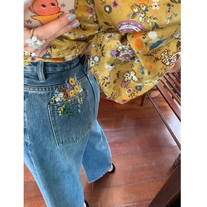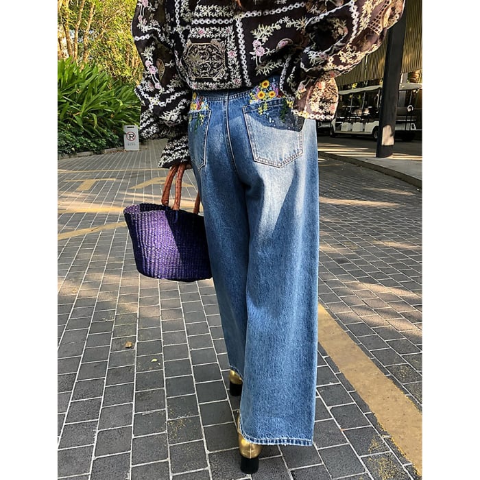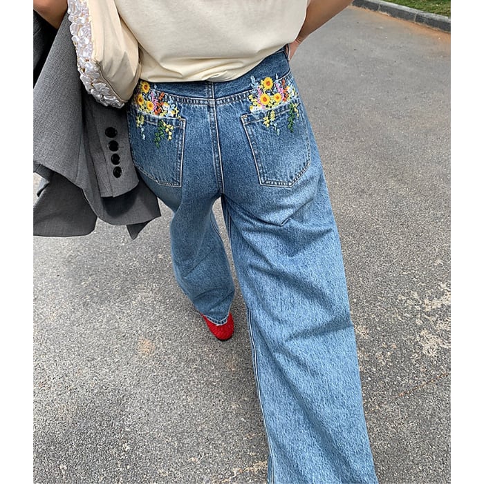 Emb.フラワークロップドストレートデニムパンツ[S-L]