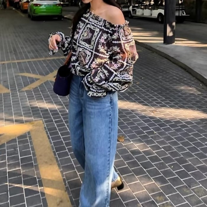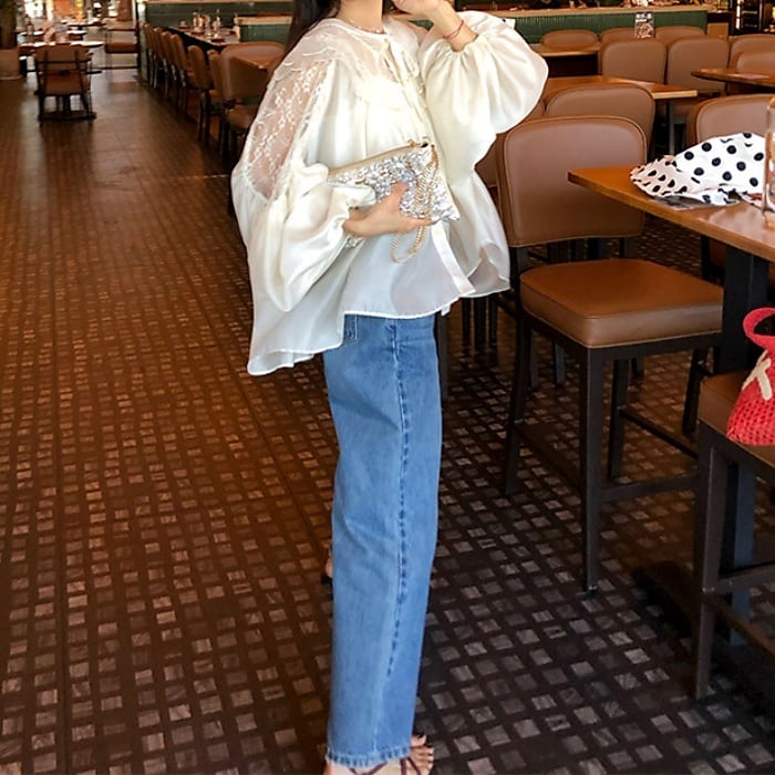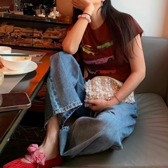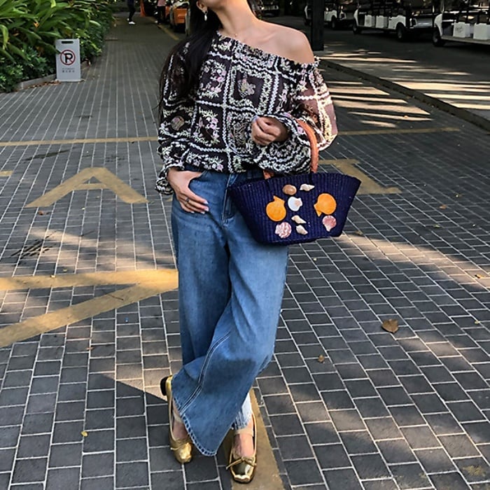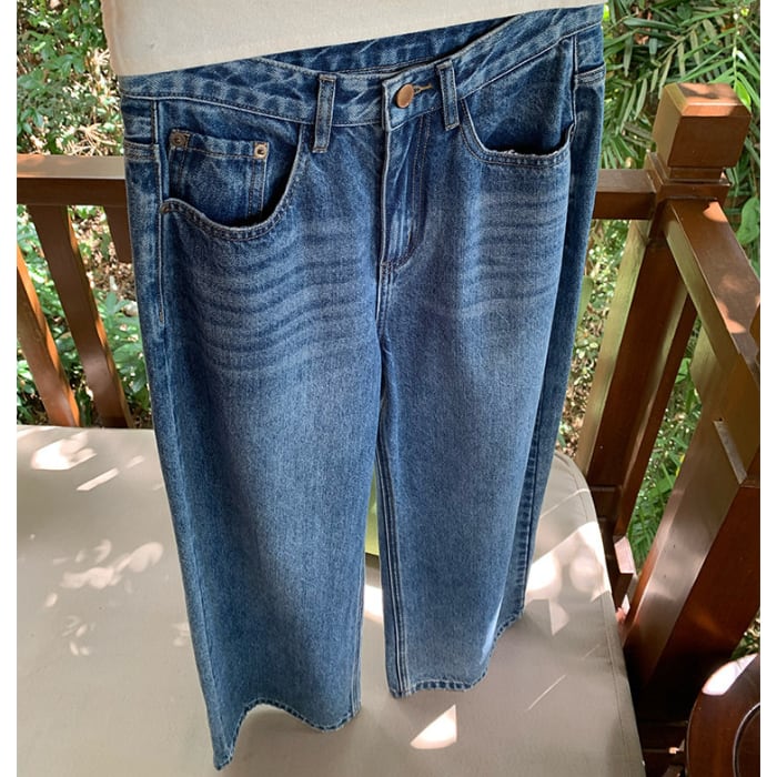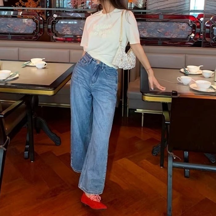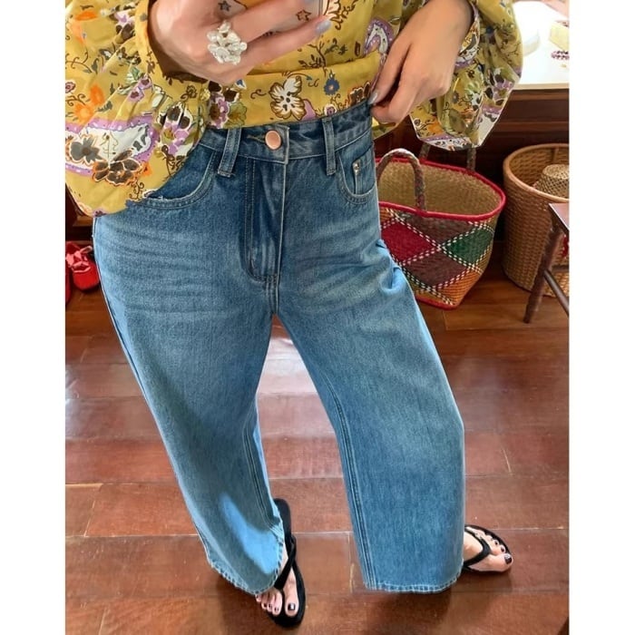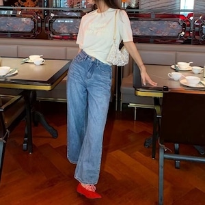 Emb.フラワークロップドストレートデニムパンツ[S-L]