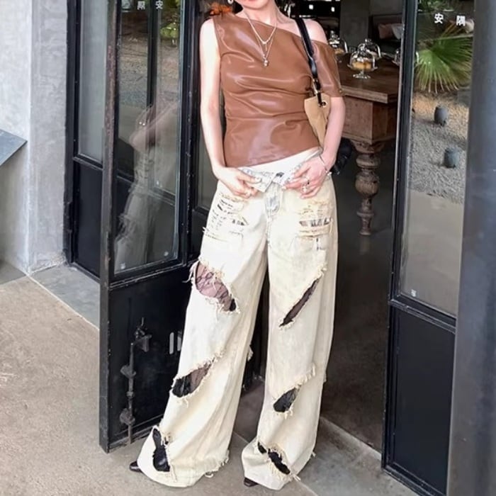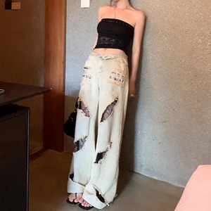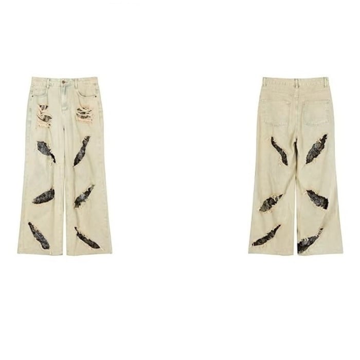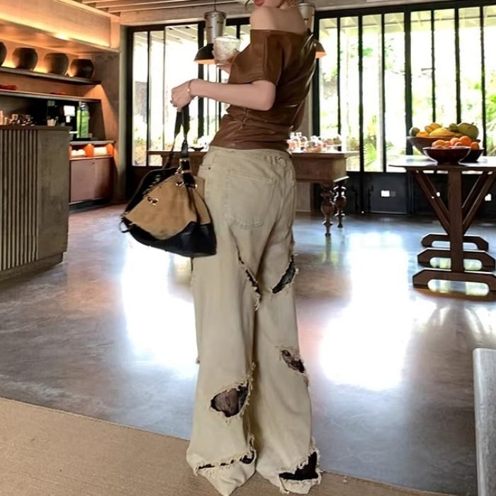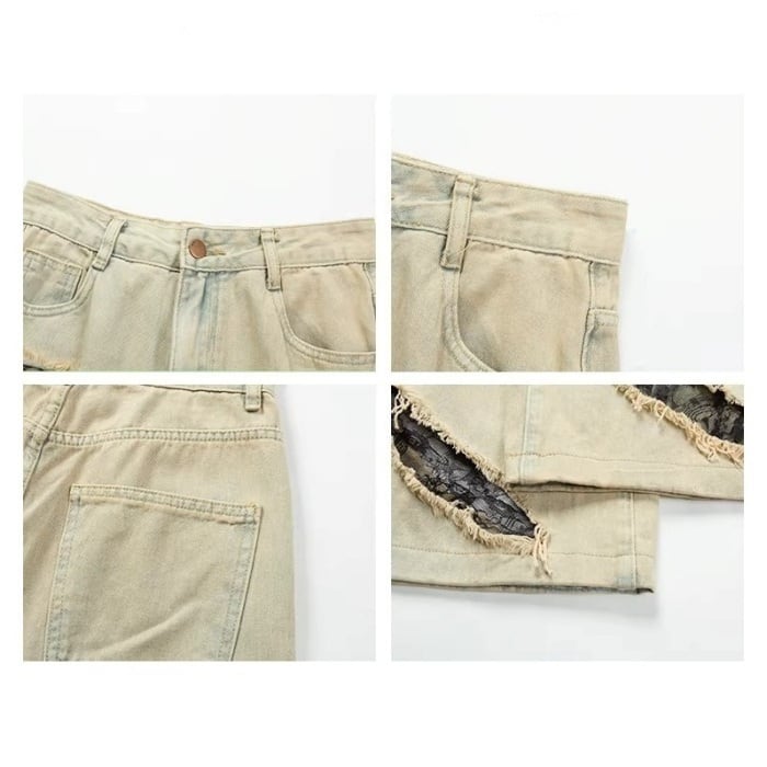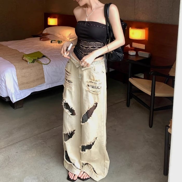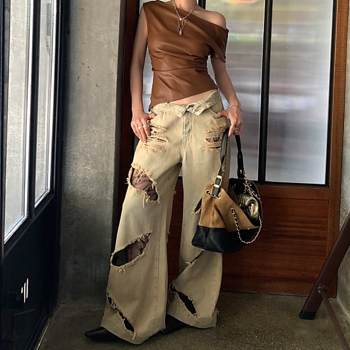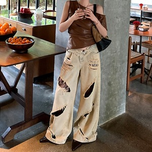 レーストリムダメージワイドデニムパンツ[S-L]