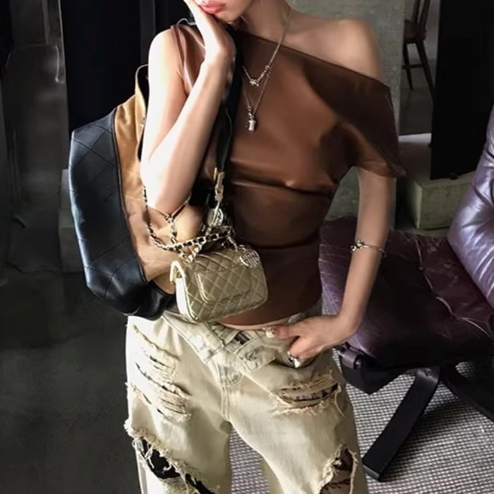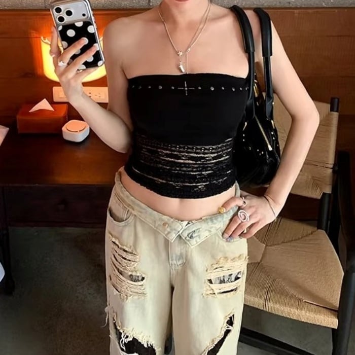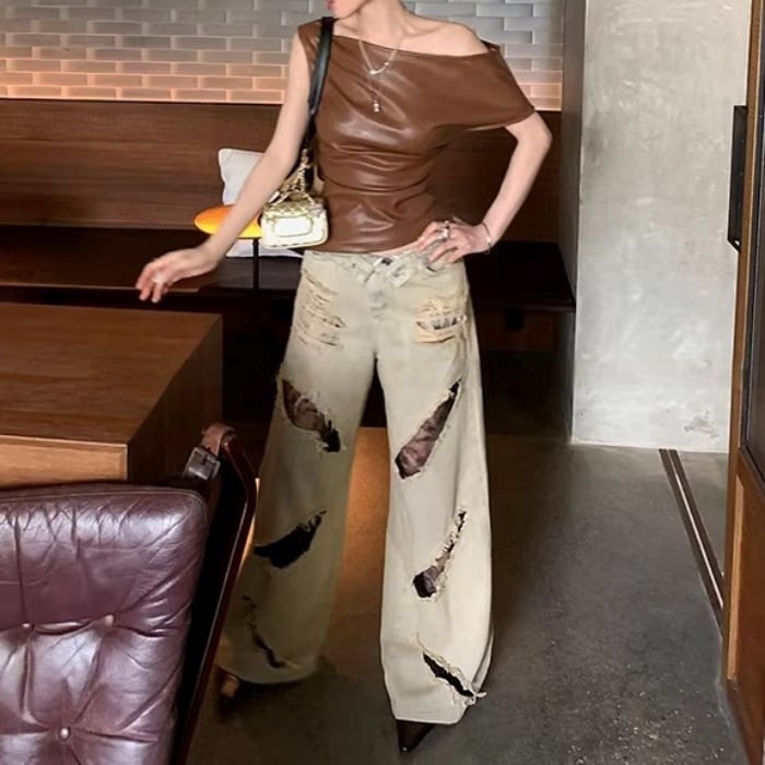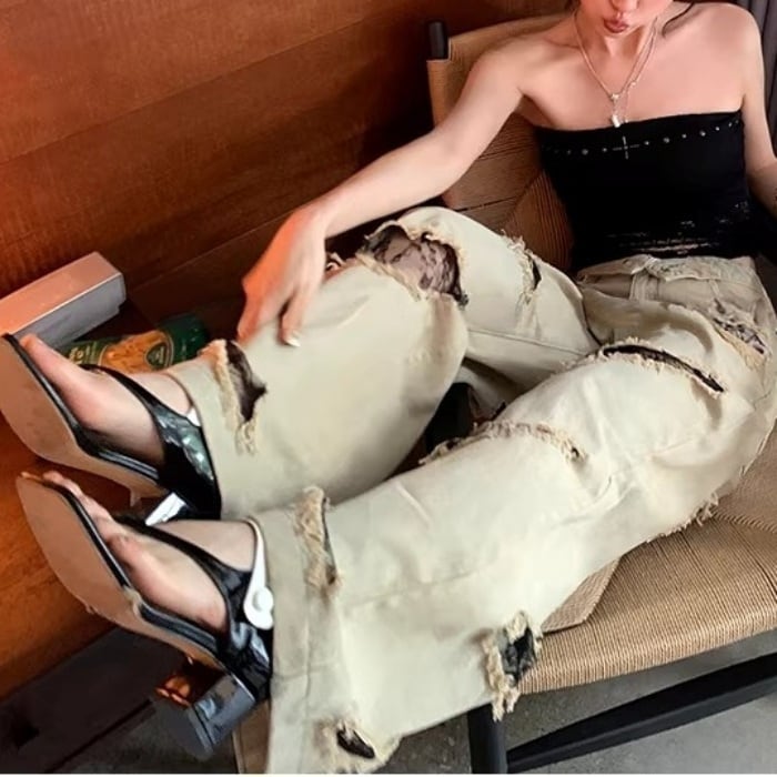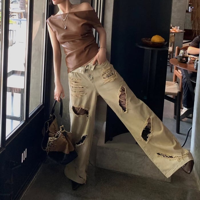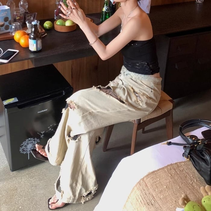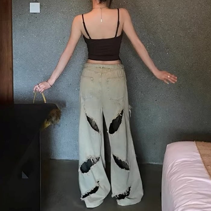 レーストリムダメージワイドデニムパンツ[S-L]