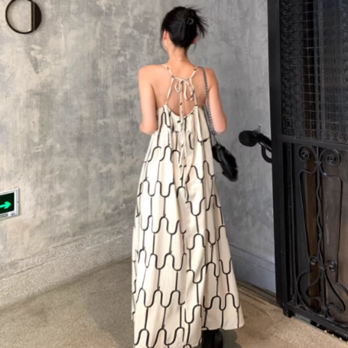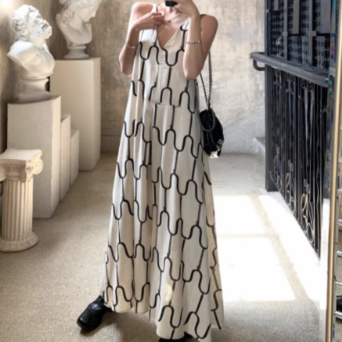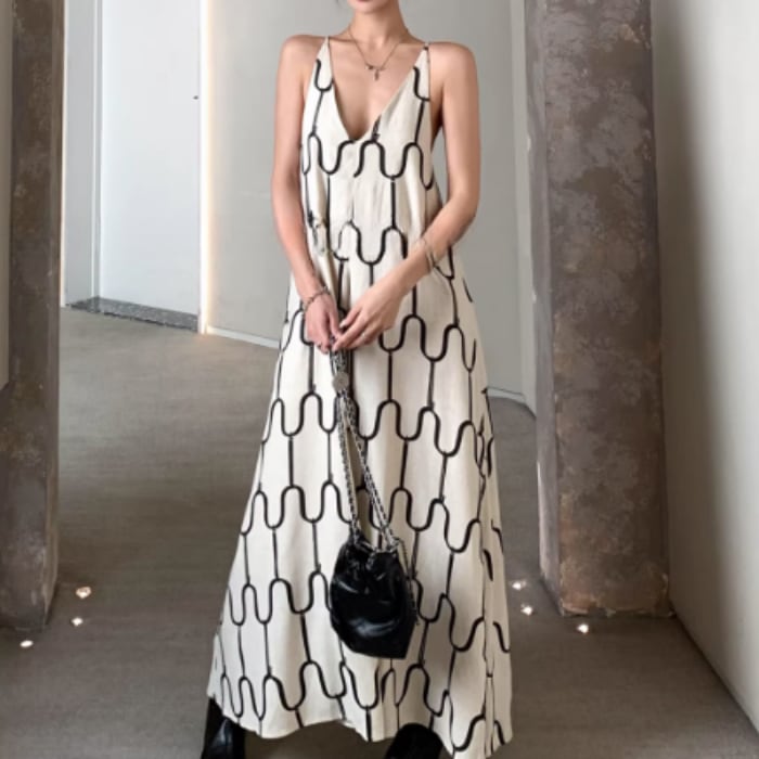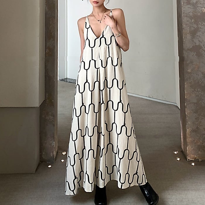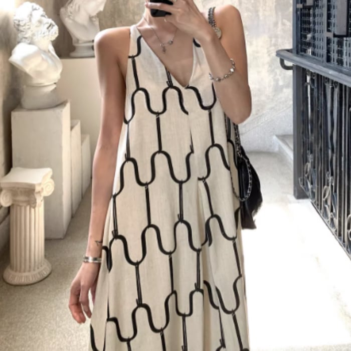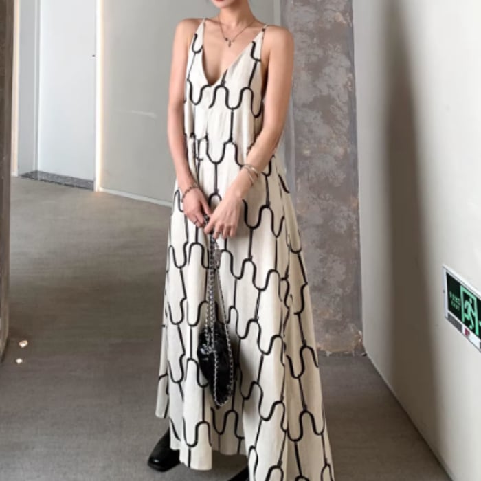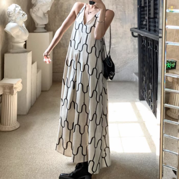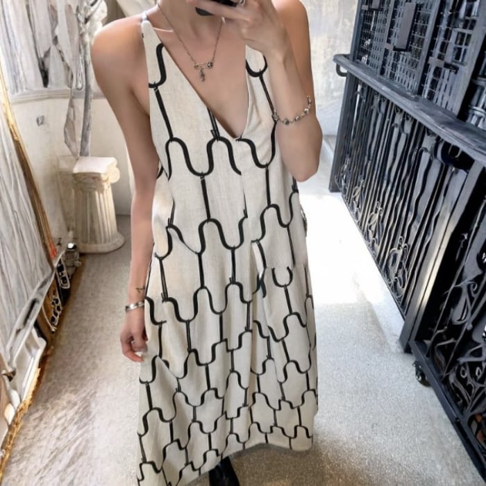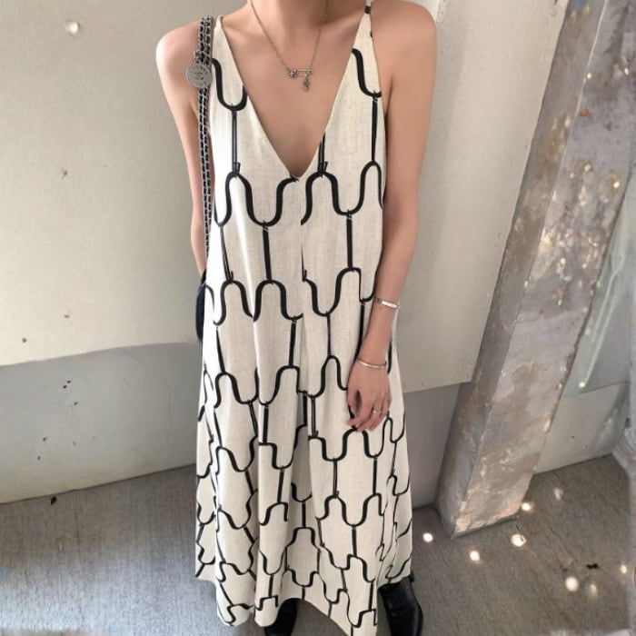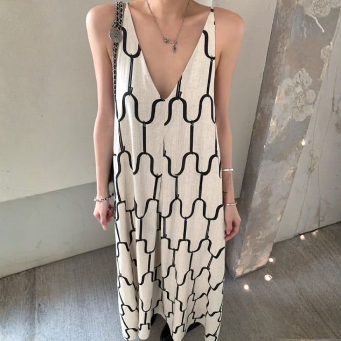 アブストラクトプリントリネンキャミソールドレス[S-M]