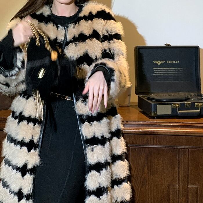珍しいストライプ柄が目を惹くラグジュアリーなエコファーコート。レザーのパイピングがエッジをプラスし、この1着でワンランク上のコーデにしてくれます