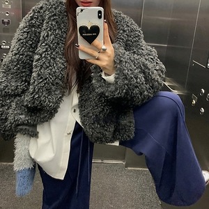 ボリュームのあるファーですが、ノーカラーでスッキリと着ていただけます。また首周りがレザーでパイピングされエッジもプラスしてくれます!